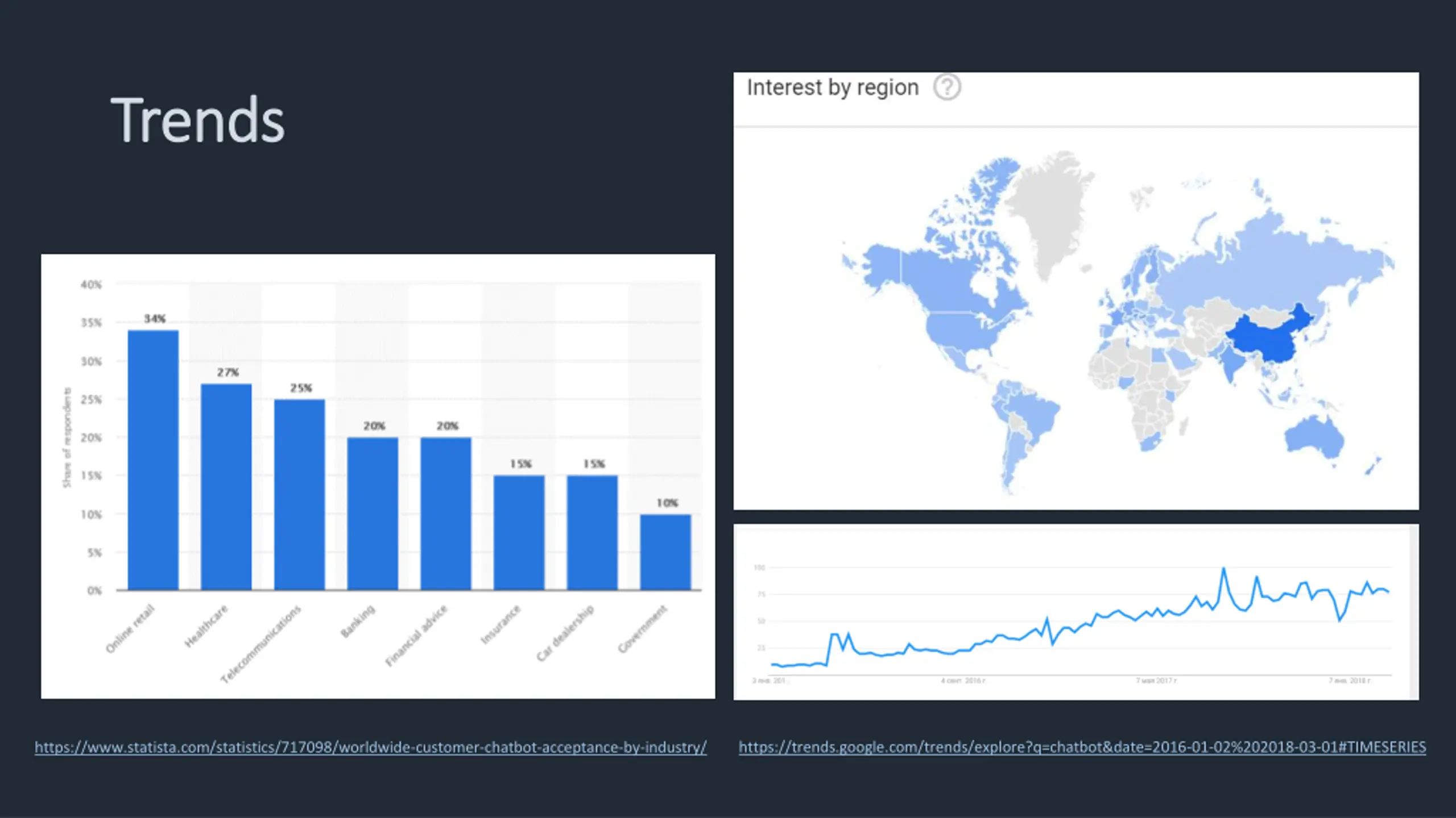 Trends Trends https://trends.google.com/trends/explore?q=chatbot&date=2016-01-02%202018-03-01#TIMESERIES https://www.statista.com/statistics/717098/worldwide-customer-chatbot-acceptance-by-industry/