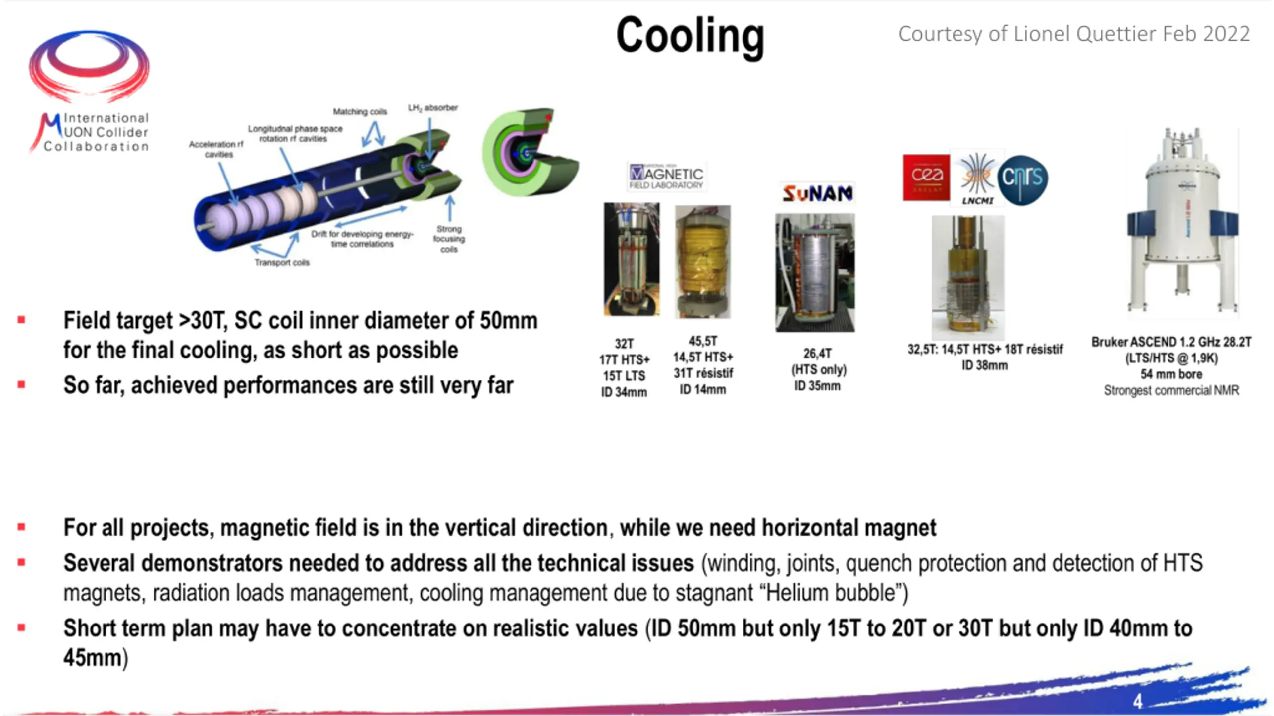 HTS Magnets for Muon Collider Commercial HTS conductors have come a long way: Utilisable Jc and piece length beyond the field limit of Nb3Sn Performance are still improving A heathy mix of suppliers/developers But cost still very high High field LTS solenoids are ahead of LTS high field accelerator magnets Solenoids: structurally simpler, long established base in laboratory settings 1GHz NMR at 23.5T has been available for more than 10 years ReBCO 2G performance capabilities demonstrated in pancake coils 26T a standalone stack of pancakes in 2016 (Yoon) Little Big Coil LBC produced 14.4T inside 31.1T resistive magnet in 2019 (Hanh) 1260A/mm2 at 45T ReBCO 2G pancake coils still far from technology proven or maturity LBC pancakes suffered extensive deterioration after field/thermal cycling Non-insulated and non-impregnated ReBCO windings yet to be proven beyond demo coils Intrinsic vulnerability of extensive joints in stack of double pancakes: possible due to direct contact to the winding and integral to the mechanical support ReBCO delamination more susceptible to micromovement in non-impregnated coils Impregnation likely unavoidable for mechanical robustness of larger coils Muon cooling magnets offers a promising case for high field HTS solenoid