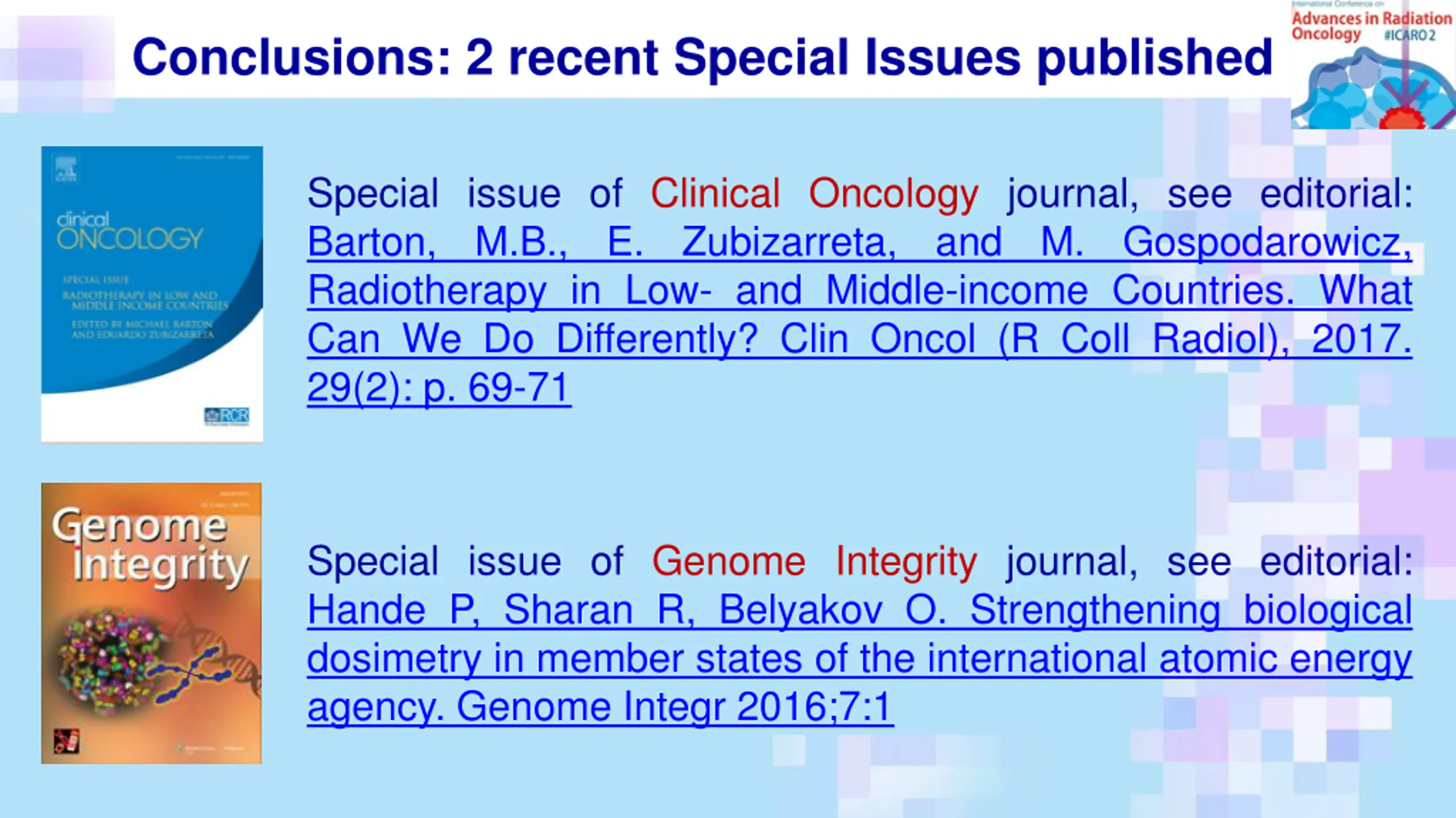 Conclusions: 2 recent Special Issues published Special issue of Clinical Oncology journal, see editorial: Barton, M.B., E. Zubizarreta, and M. Gospodarowicz, Radiotherapy in Low- and Middle-income Countries. What Can We Do Differently? Clin Oncol (R Coll Radiol), 2017. 29(2): p. 69-71 Special issue of Genome Integrity journal, see editorial: Hande P, Sharan R, Belyakov O. Strengthening biological dosimetry in member states of the international atomic energy agency. Genome Integr 2016;7:1