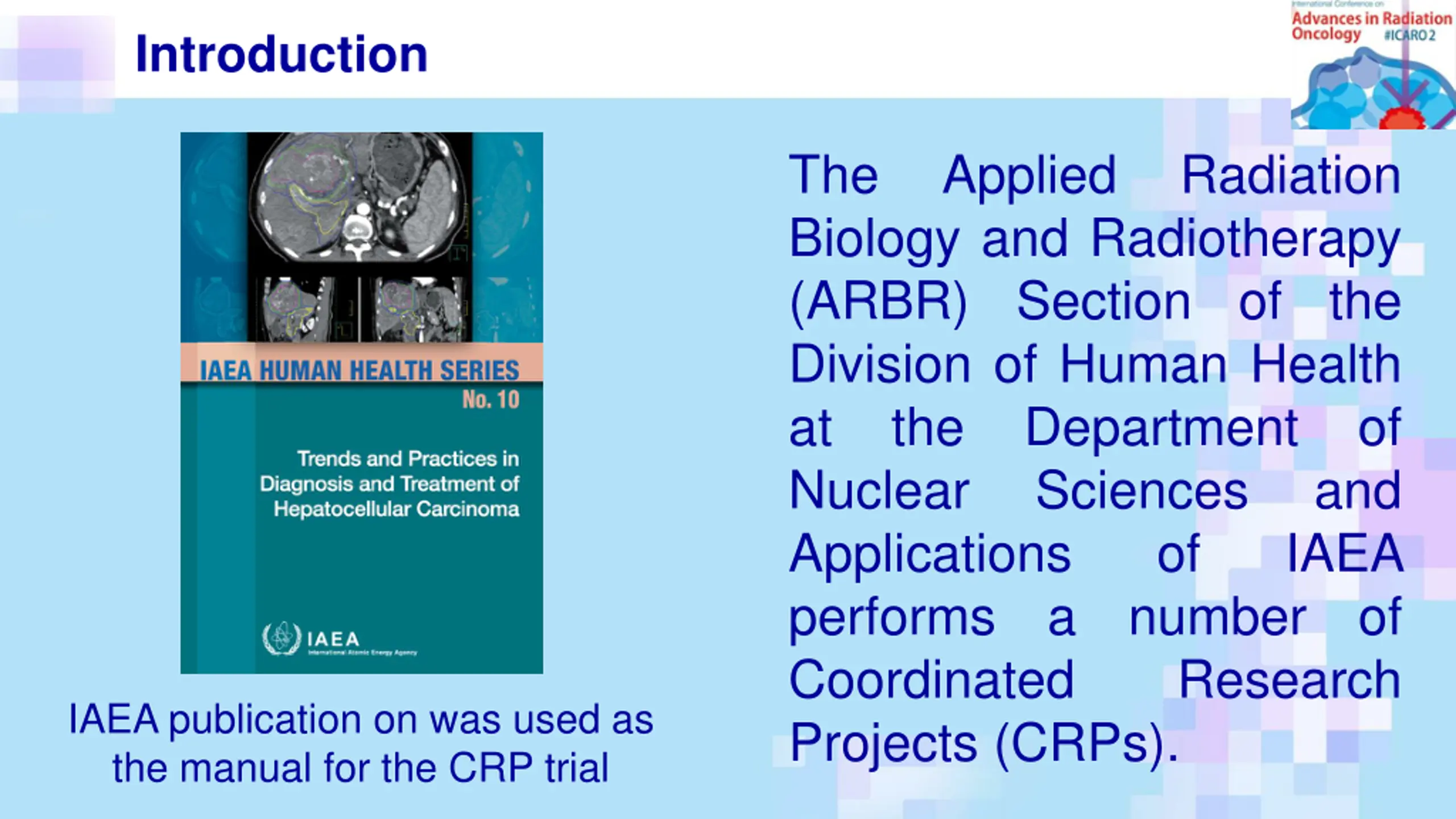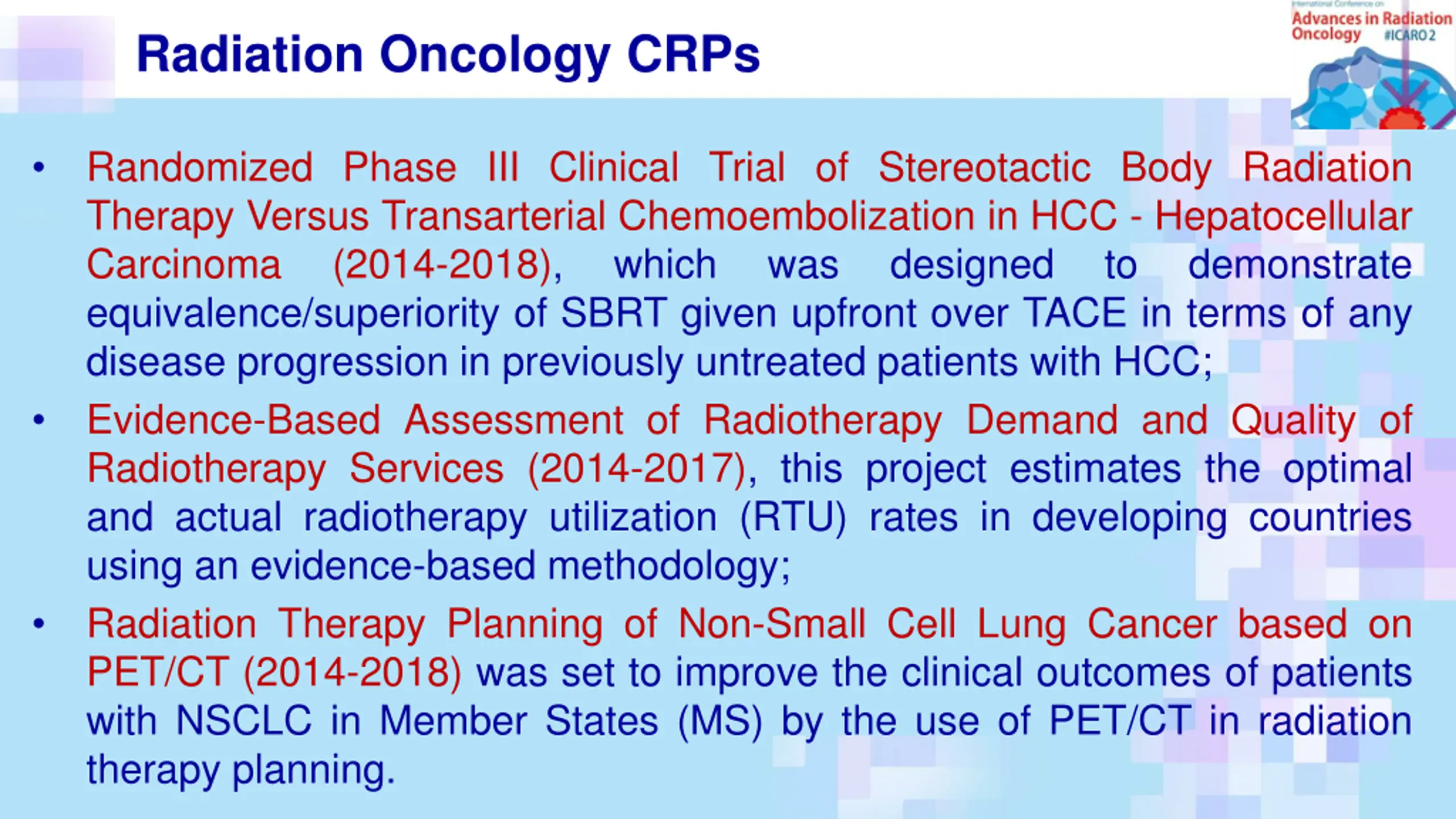 Radiation Oncology CRPs Randomized Phase III Clinical Trial of Stereotactic Body Radiation Therapy Versus Transarterial Chemoembolization in HCC - Hepatocellular Carcinoma (2014-2018), which equivalence/superiority of SBRT given upfront over TACE in terms of any disease progression in previously untreated patients with HCC; Evidence-Based Assessment of Radiotherapy Demand and Quality of Radiotherapy Services (2014-2017), this project estimates the optimal and actual radiotherapy utilization (RTU) rates in developing countries using an evidence-based methodology; Radiation Therapy Planning of Non-Small Cell Lung Cancer based on PET/CT (2014-2018) was set to improve the clinical outcomes of patients with NSCLC in Member States (MS) by the use of PET/CT in radiation therapy planning. was designed to demonstrate