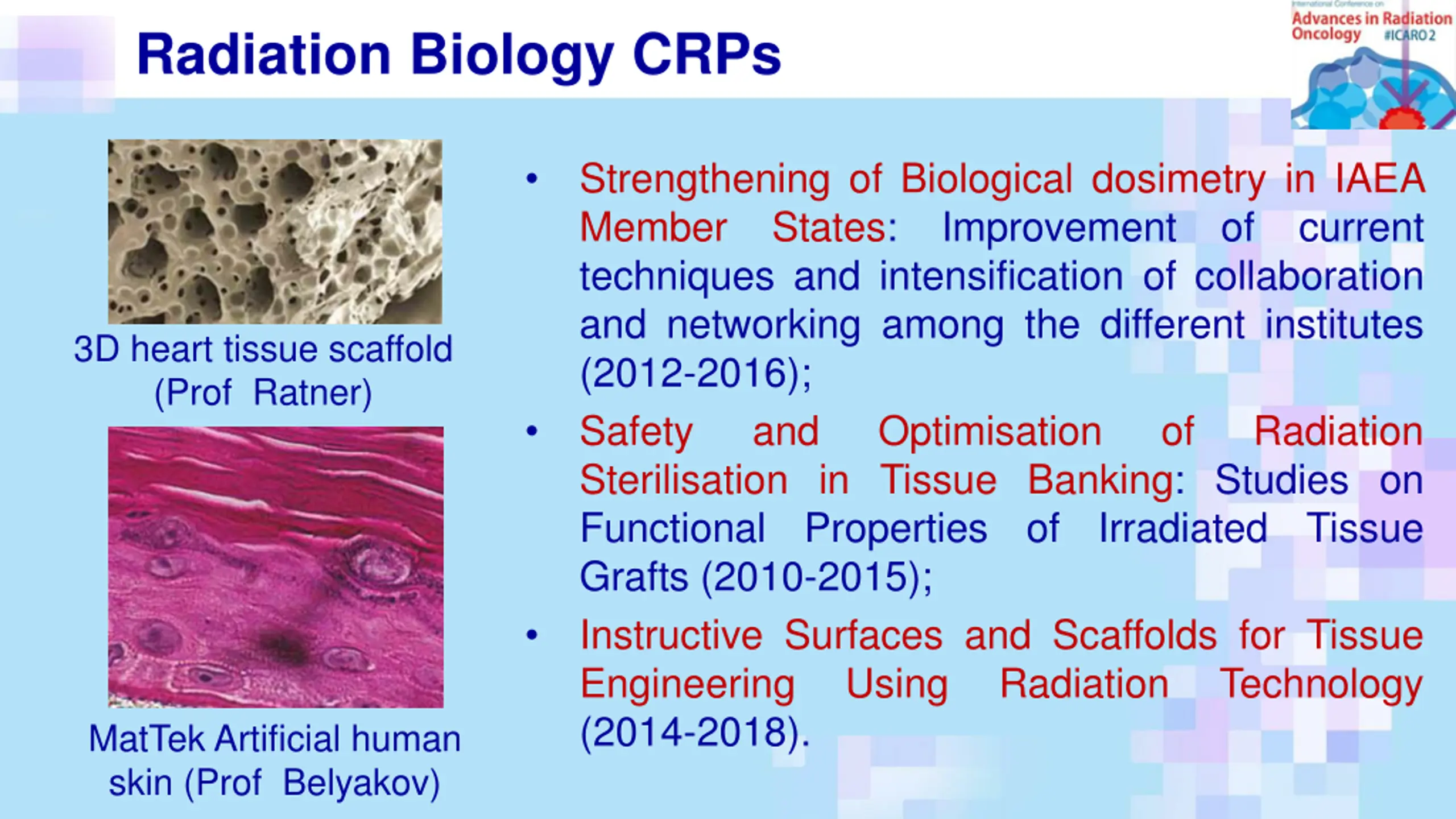 Radiation Biology CRPs Strengthening of Biological dosimetry in IAEA Member States: Improvement techniques and intensification of collaboration and networking among the different institutes (2012-2016); Safety and Optimisation Sterilisation in Tissue Banking: Studies on Functional Properties Grafts (2010-2015); Instructive Surfaces and Scaffolds for Tissue Engineering Using Radiation (2014-2018). of current 3D heart tissue scaffold (Prof Ratner) of Radiation of Irradiated Tissue Technology MatTek Artificial human skin (Prof Belyakov)