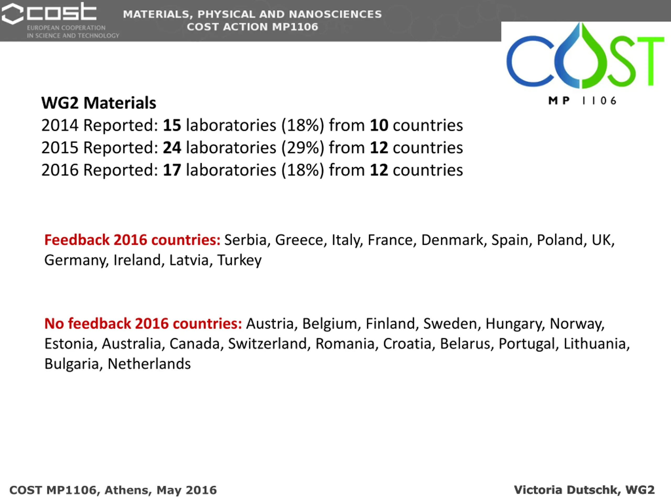 WG2 Materials 2014 Reported: 15 laboratories (18%) from 10 countries 2015 Reported: 24 laboratories (29%) from 12 countries 2016 Reported: 17 laboratories (18%) from 12 countries Feedback 2016 countries: Serbia, Greece, Italy, France, Denmark, Spain, Poland, UK, Germany, Ireland, Latvia, Turkey No feedback 2016 countries: Austria, Belgium, Finland, Sweden, Hungary, Norway, Estonia, Australia, Canada, Switzerland, Romania, Croatia, Belarus, Portugal, Lithuania, Bulgaria, Netherlands Victoria Dutschk, WG2 Victoria Dutschk, WG2 COST MP1106, Athens, May 2016