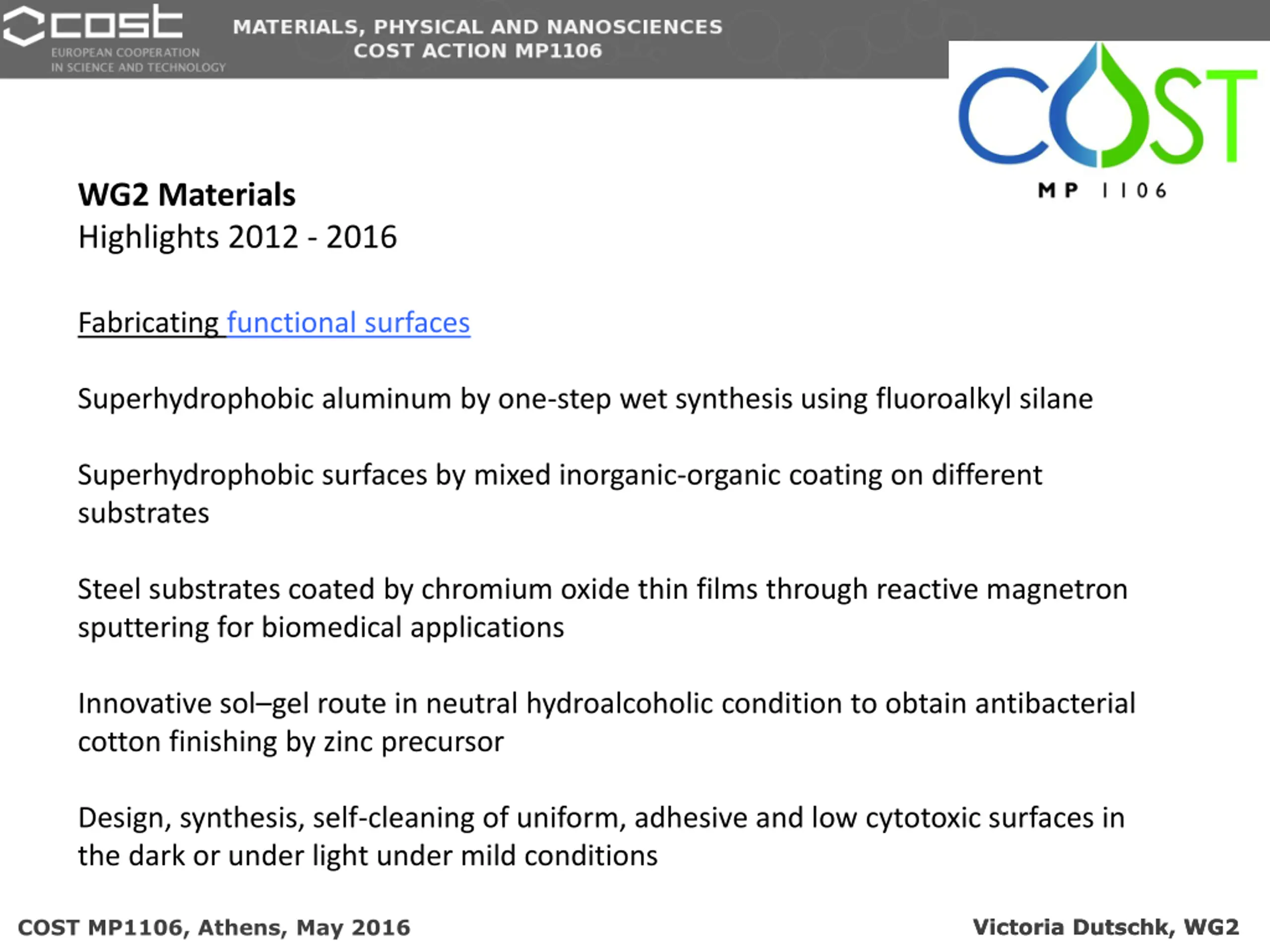 WG2 Materials Highlights 2012 - 2016 Fabricating functional surfaces Superhydrophobic aluminum by one-step wet synthesis using fluoroalkyl silane Superhydrophobic surfaces by mixed inorganic-organic coating on different substrates Steel substrates coated by chromium oxide thin films through reactive magnetron sputtering for biomedical applications Innovative sol gel route in neutral hydroalcoholic condition to obtain antibacterial cotton finishing by zinc precursor Design, synthesis, self-cleaning of uniform, adhesive and low cytotoxic surfaces in the dark or under light under mild conditions Victoria Dutschk, WG2 Victoria Dutschk, WG2 COST MP1106, Athens, May 2016