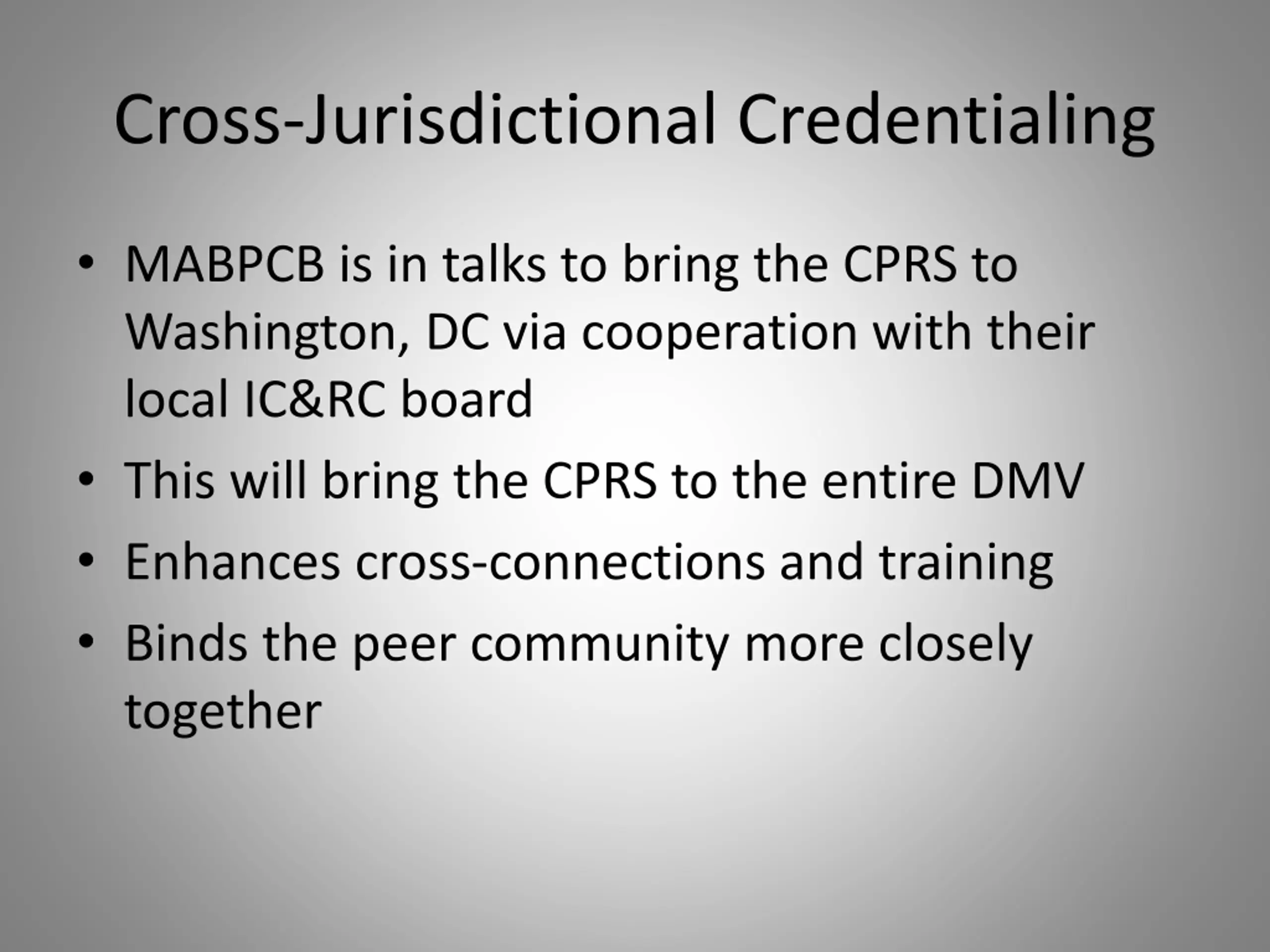 Cross-Jurisdictional Credentialing MABPCB is in talks to bring the CPRS to Washington, DC via cooperation with their local IC&RC board This will bring the CPRS to the entire DMV Enhances cross-connections and training Binds the peer community more closely together