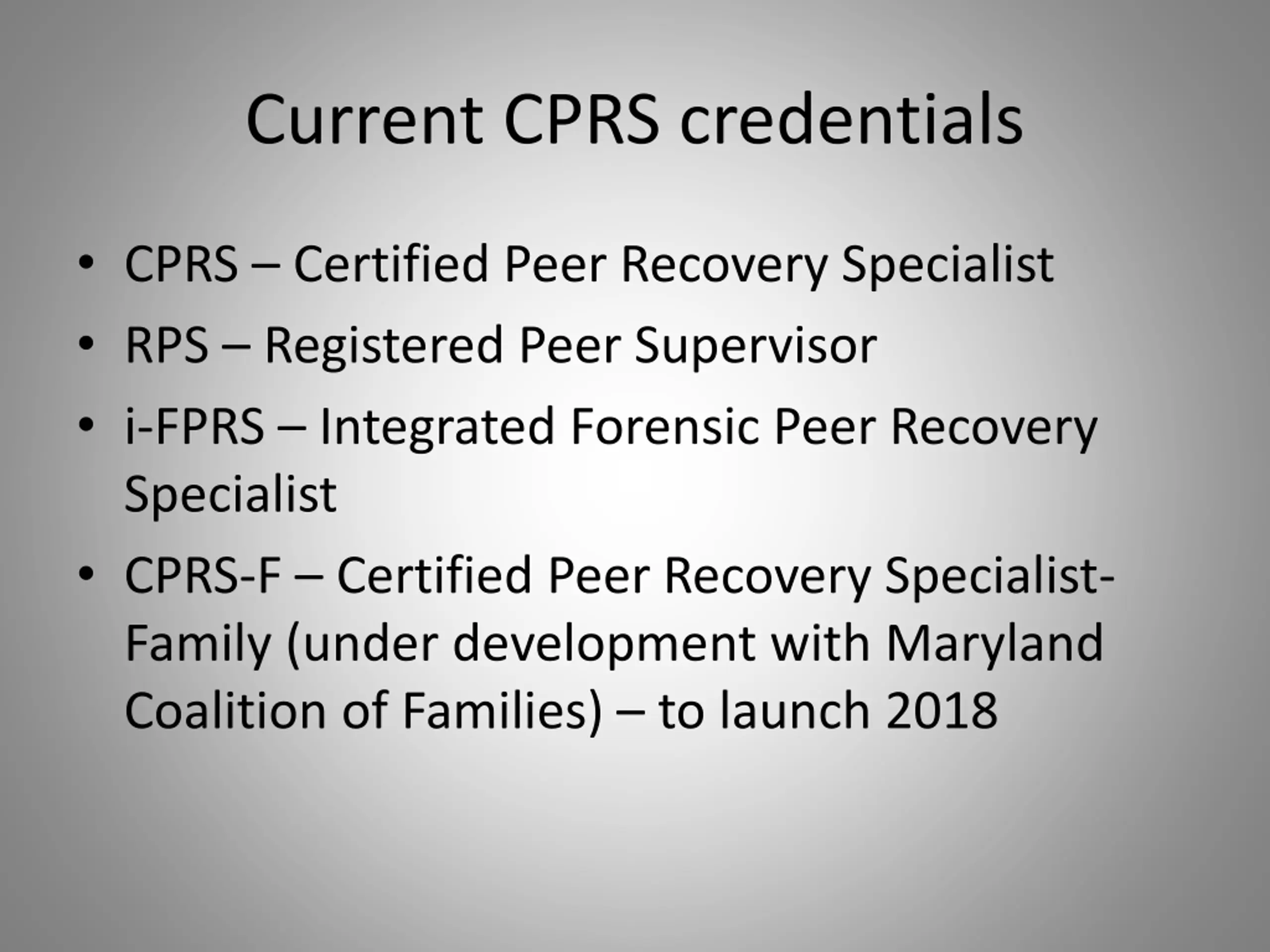 Current CPRS credentials CPRS Certified Peer Recovery Specialist RPS Registered Peer Supervisor i-FPRS Integrated Forensic Peer Recovery Specialist CPRS-F Certified Peer Recovery Specialist- Family (under development with Maryland Coalition of Families) to launch 2018