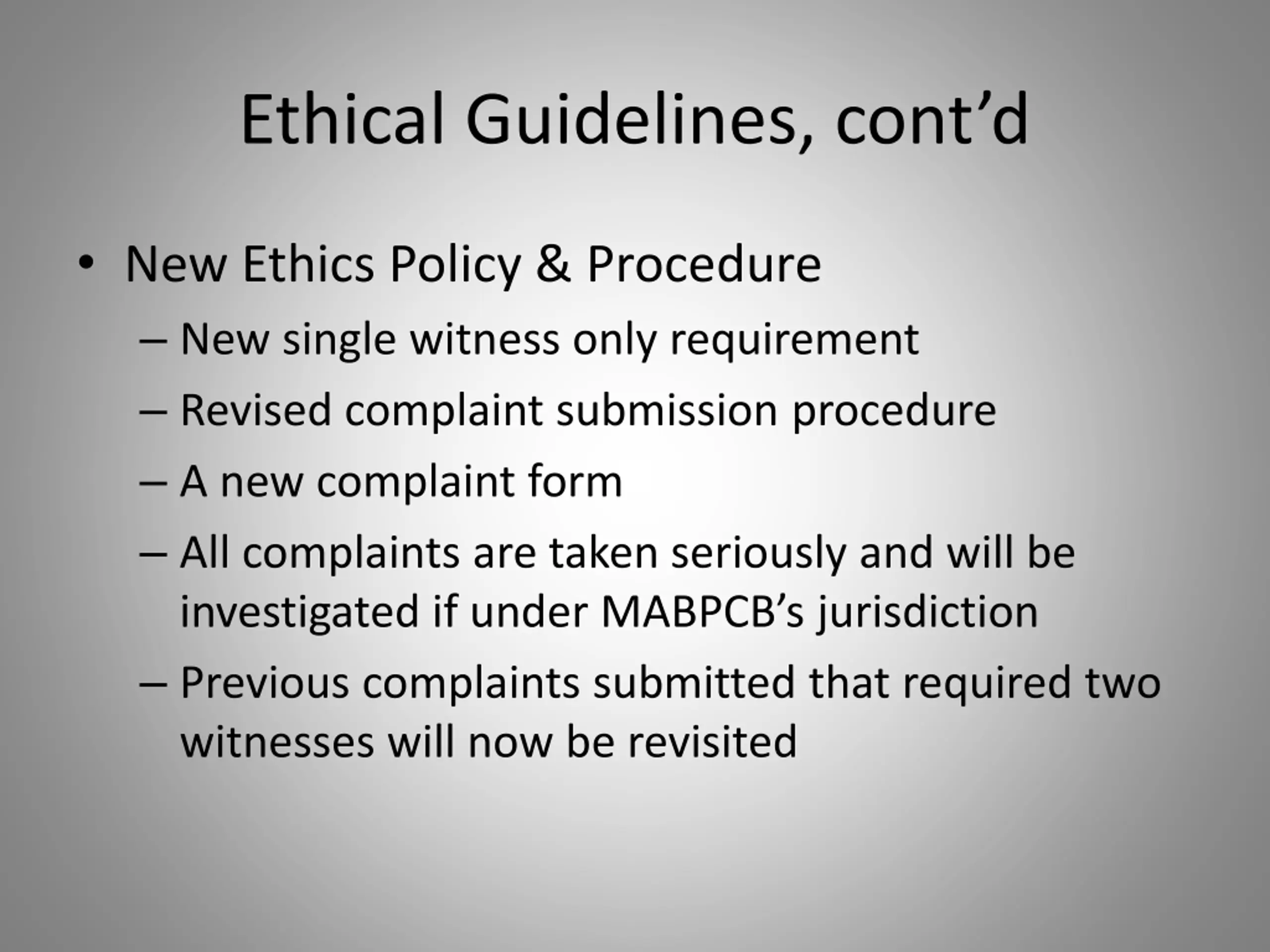Ethical Guidelines, contd New Ethics Policy & Procedure New single witness only requirement Revised complaint submission procedure A new complaint form All complaints are taken seriously and will be investigated if under MABPCB s jurisdiction Previous complaints submitted that required two witnesses will now be revisited