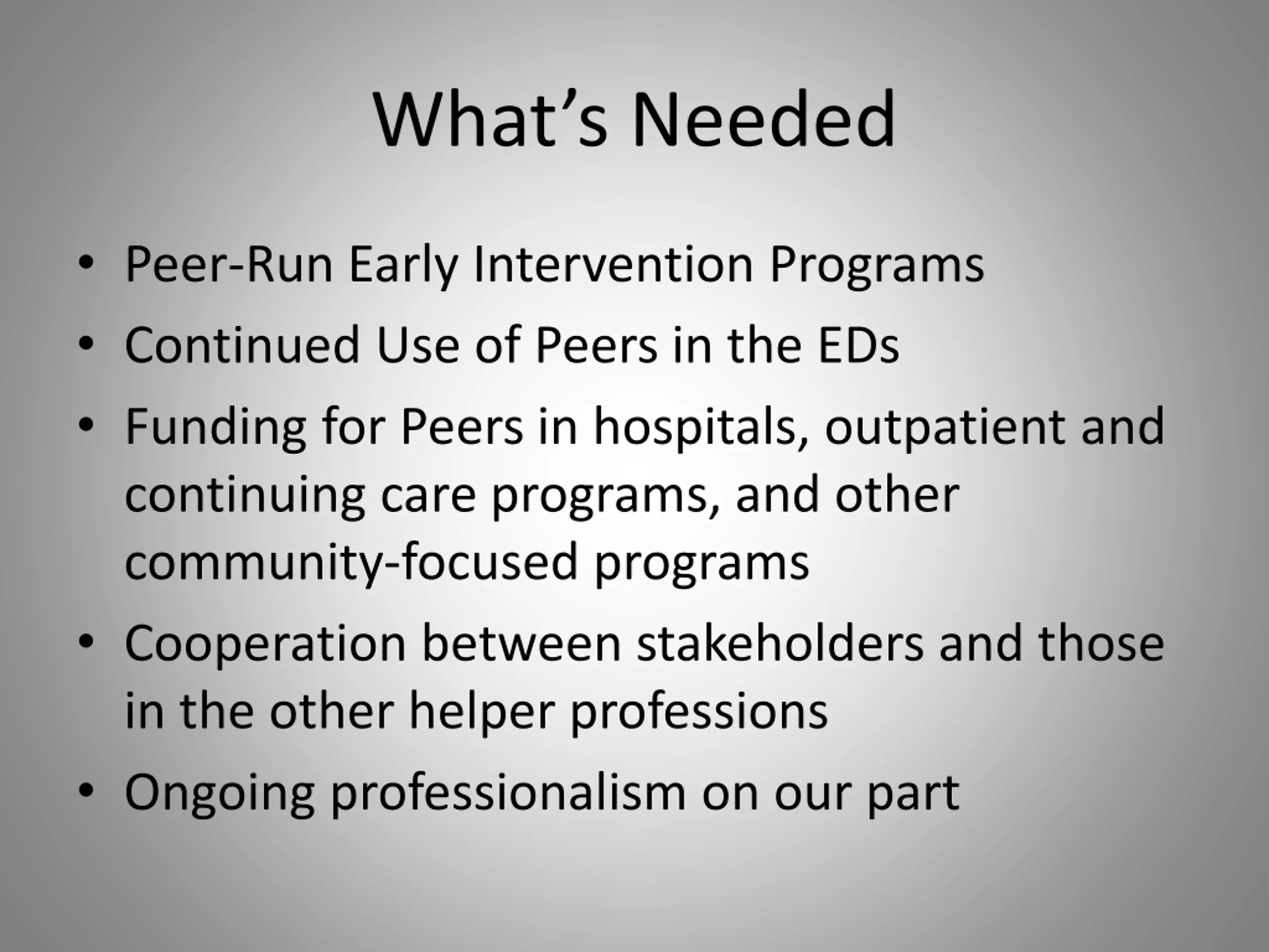 Whats Needed Peer-Run Early Intervention Programs Continued Use of Peers in the EDs Funding for Peers in hospitals, outpatient and continuing care programs, and other community-focused programs Cooperation between stakeholders and those in the other helper professions Ongoing professionalism on our part