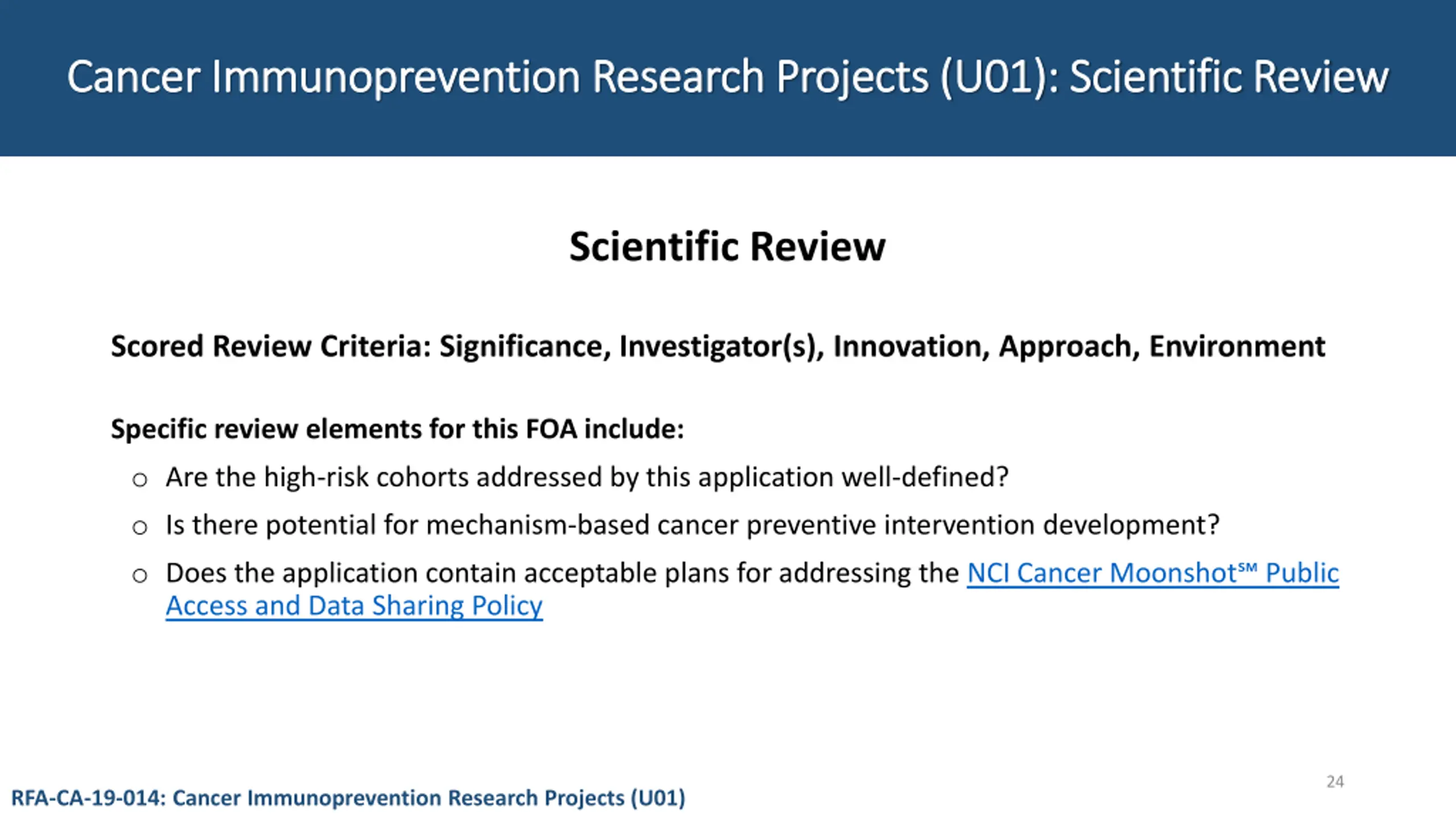 Cancer Immunoprevention Research Projects (U01): Scientific Review Cancer Immunoprevention Research Projects (U01): Scientific Review Scientific Review Scored Review Criteria: Significance, Investigator(s), Innovation, Approach, Environment Specific review elements for this FOA include: o Are the high-risk cohorts addressed by this application well-defined? o Is there potential for mechanism-based cancer preventive intervention development? o Does the application contain acceptable plans for addressing the NCI Cancer Moonshot Public Access and Data Sharing Policy 24 RFA-CA-19-014: Cancer Immunoprevention Research Projects (U01)