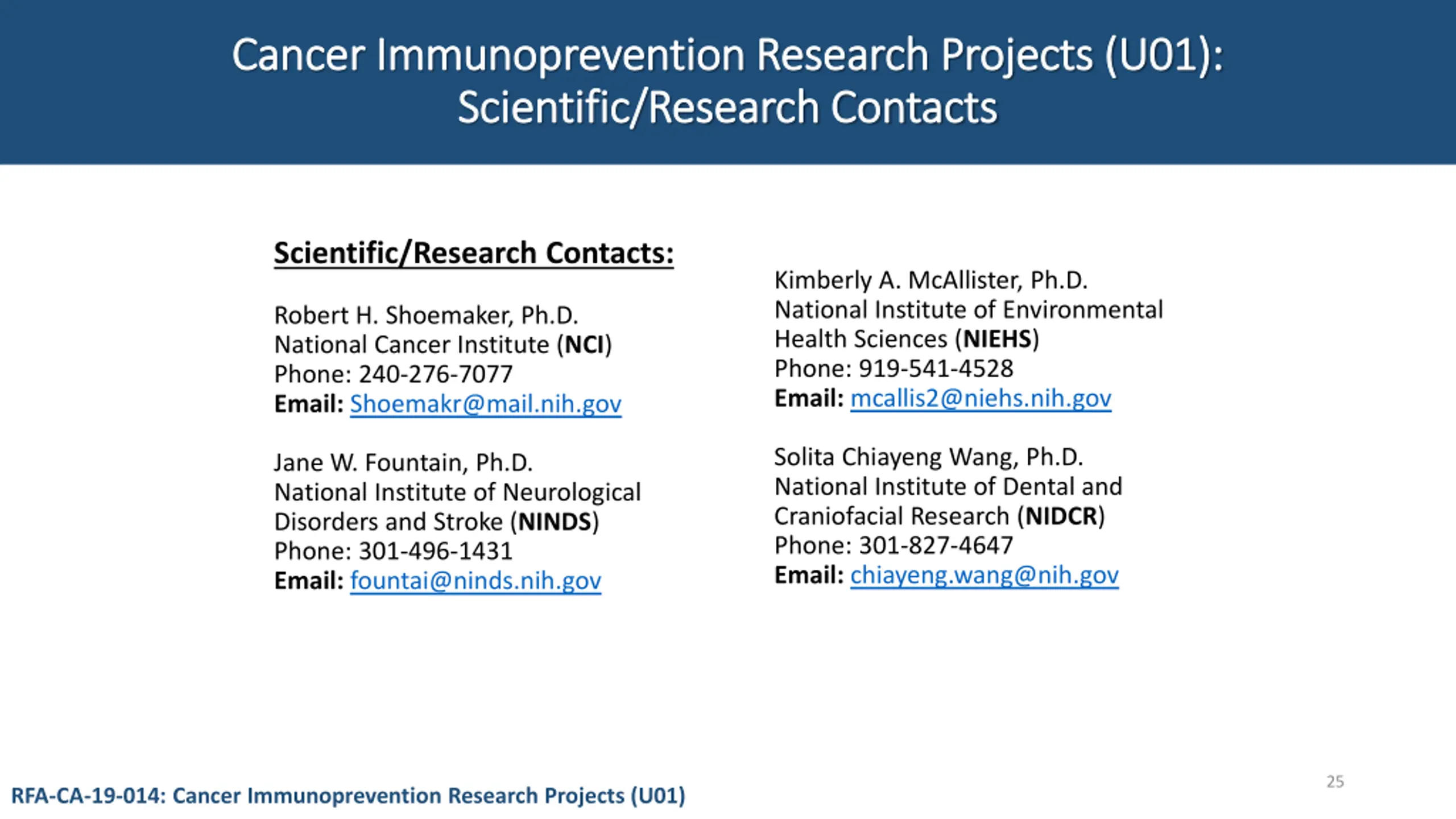 Cancer Immunoprevention Research Projects (U01): Cancer Immunoprevention Research Projects (U01): Scientific/Research Contacts Scientific/Research Contacts Scientific/Research Contacts: Kimberly A. McAllister, Ph.D. National Institute of Environmental Health Sciences (NIEHS) Phone: 919-541-4528 Email: mcallis2@niehs.nih.gov Robert H. Shoemaker, Ph.D. National Cancer Institute (NCI) Phone: 240-276-7077 Email: Shoemakr@mail.nih.gov Solita Chiayeng Wang, Ph.D. National Institute of Dental and Craniofacial Research (NIDCR) Phone: 301-827-4647 Email: chiayeng.wang@nih.gov Jane W. Fountain, Ph.D. National Institute of Neurological Disorders and Stroke (NINDS) Phone: 301-496-1431 Email: fountai@ninds.nih.gov 25 RFA-CA-19-014: Cancer Immunoprevention Research Projects (U01)