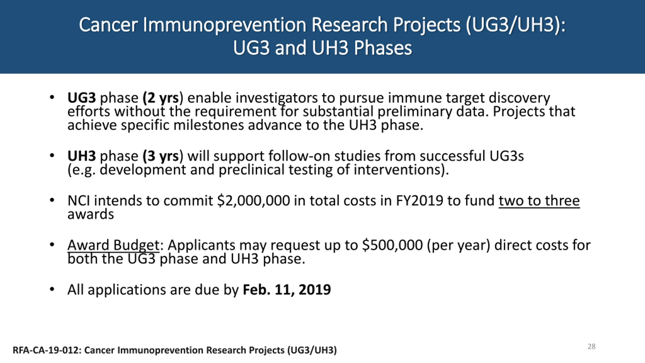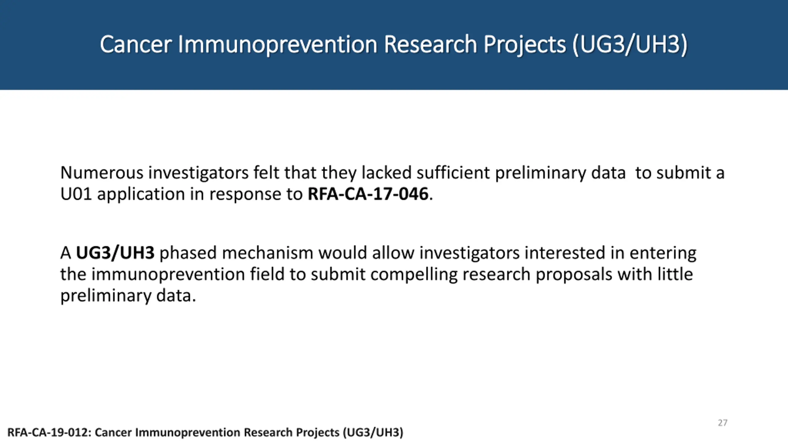 Cancer Immunoprevention Research Projects (UG3/UH3) Cancer Immunoprevention Research Projects (UG3/UH3) Numerous investigators felt that they lacked sufficient preliminary data to submit a U01 application in response to RFA-CA-17-046. A UG3/UH3 phased mechanism would allow investigators interested in entering the immunoprevention field to submit compelling research proposals with little preliminary data. 27 RFA-CA-19-012: Cancer Immunoprevention Research Projects (UG3/UH3)