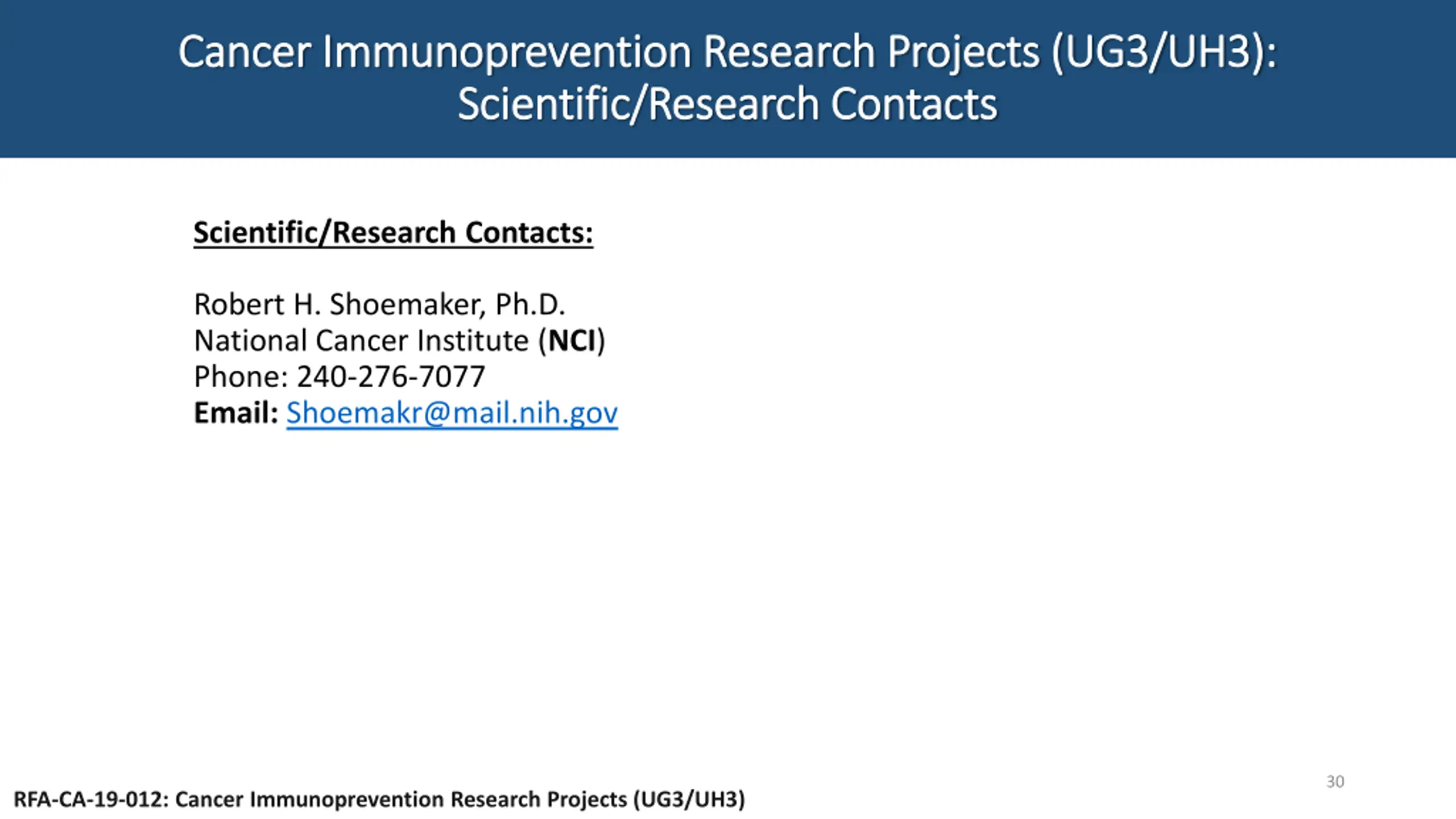 Cancer Immunoprevention Research Projects (UG3/UH3): Cancer Immunoprevention Research Projects (UG3/UH3): Scientific/Research Contacts Scientific/Research Contacts Scientific/Research Contacts: Robert H. Shoemaker, Ph.D. National Cancer Institute (NCI) Phone: 240-276-7077 Email: Shoemakr@mail.nih.gov 30 RFA-CA-19-012: Cancer Immunoprevention Research Projects (UG3/UH3)