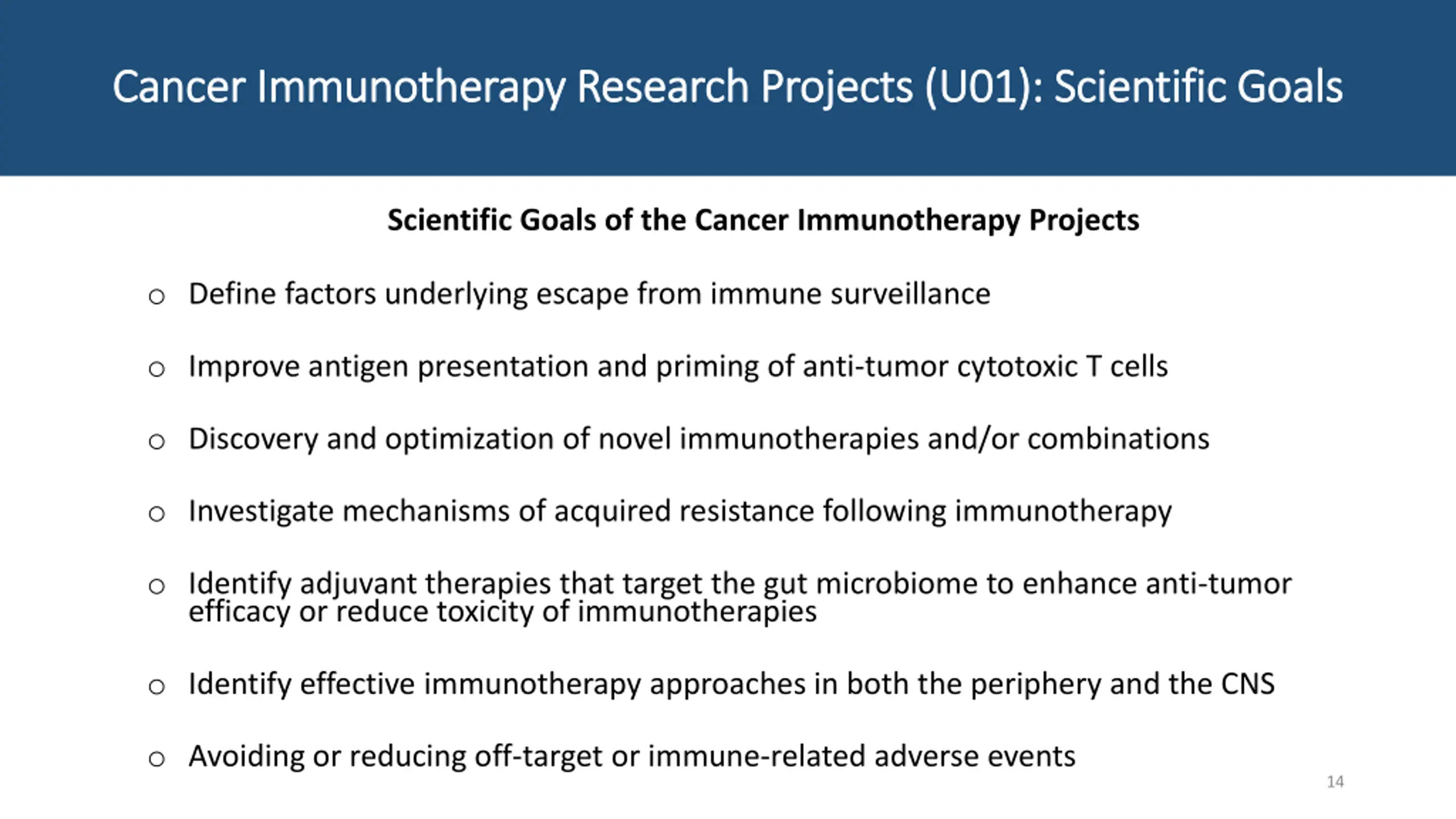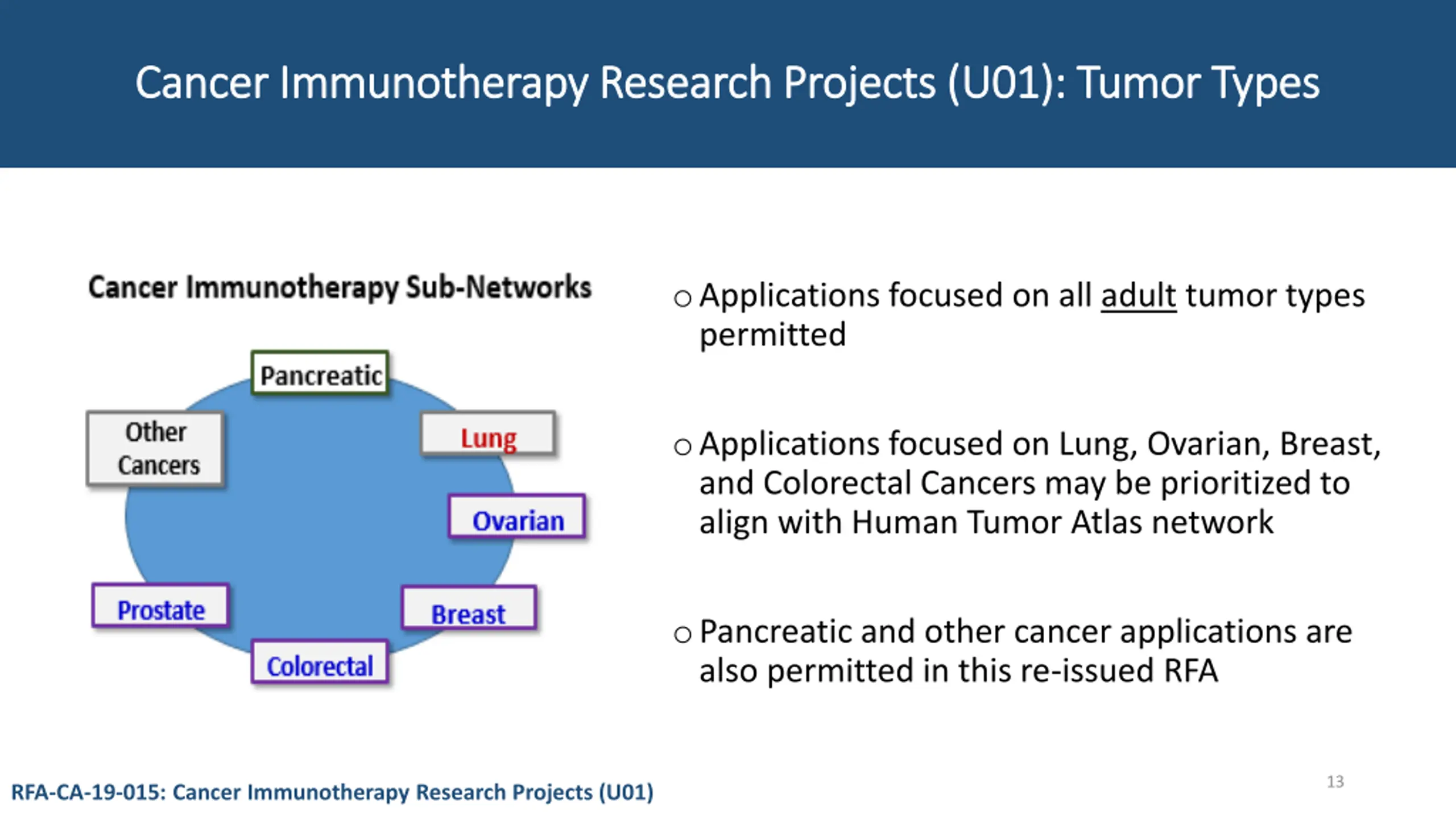 Cancer Immunotherapy Research Projects (U01): Tumor Types Cancer Immunotherapy Research Projects (U01): Tumor Types oApplications focused on all adult tumor types permitted oApplications focused on Lung, Ovarian, Breast, and Colorectal Cancers may be prioritized to align with Human Tumor Atlas network oPancreatic and other cancer applications are also permitted in this re-issued RFA 13 RFA-CA-19-015: Cancer Immunotherapy Research Projects (U01)