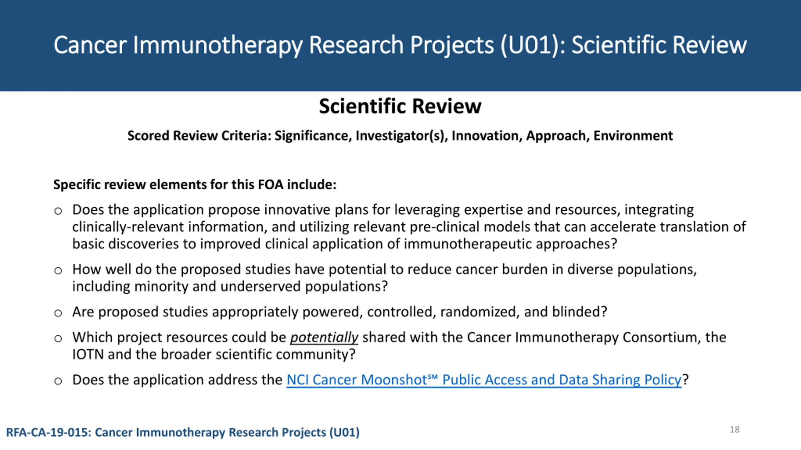 Cancer Immunotherapy Research Projects (U01): Scientific Review Cancer Immunotherapy Research Projects (U01): Scientific Review Scientific Review Scored Review Criteria: Significance, Investigator(s), Innovation, Approach, Environment Specific review elements for this FOA include: o Does the application propose innovative plans for leveraging expertise and resources, integrating clinically-relevant information, and utilizing relevant pre-clinical models that can accelerate translation of basic discoveries to improved clinical application of immunotherapeutic approaches? o How well do the proposed studies have potential to reduce cancer burden in diverse populations, including minority and underserved populations? o Are proposed studies appropriately powered, controlled, randomized, and blinded? o Which project resources could be potentially shared with the Cancer Immunotherapy Consortium, the IOTN and the broader scientific community? o Does the application address the NCI Cancer Moonshot Public Access and Data Sharing Policy? 18 RFA-CA-19-015: Cancer Immunotherapy Research Projects (U01)