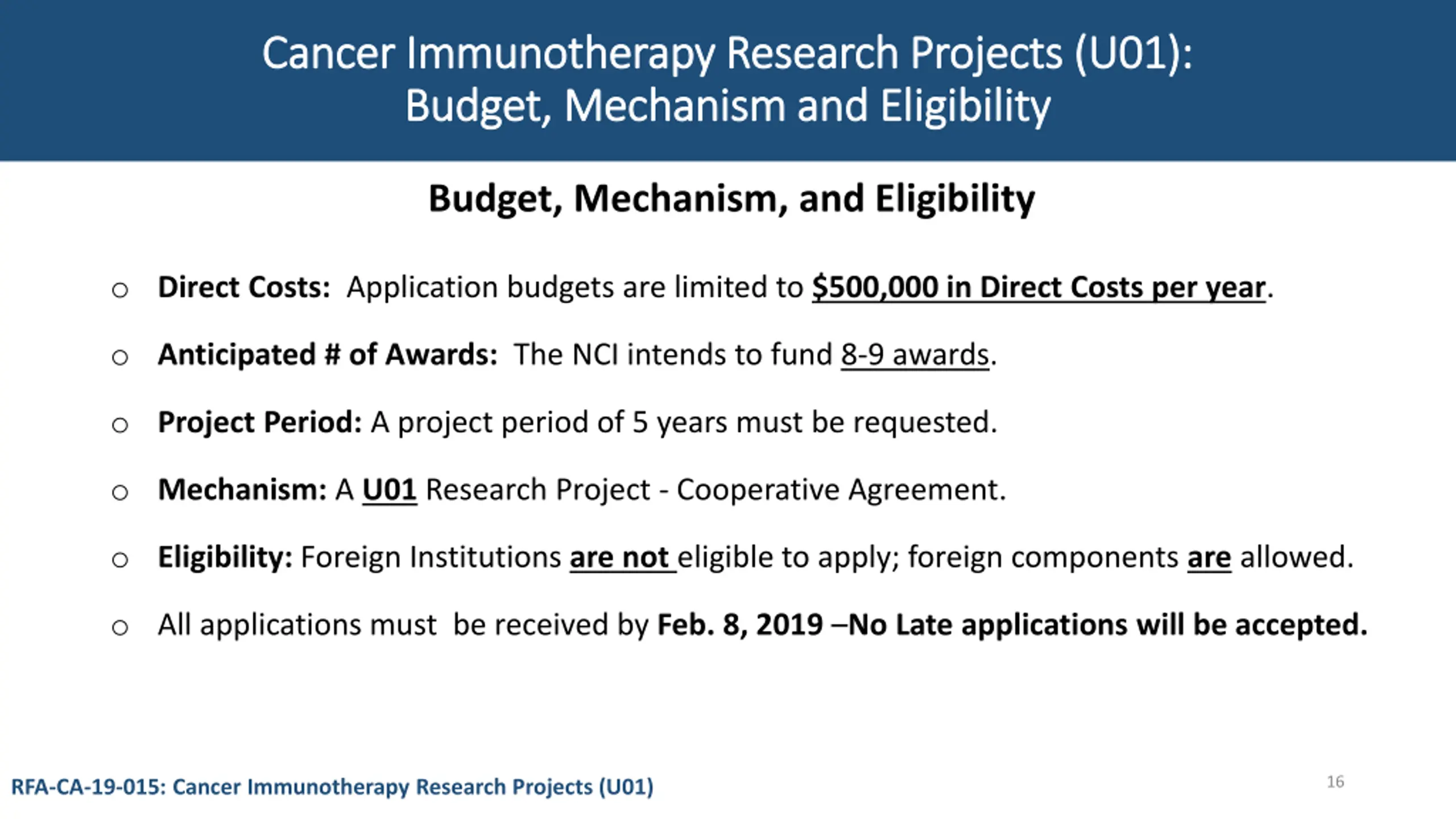 Cancer Immunotherapy Research Projects (U01): Cancer Immunotherapy Research Projects (U01): Budget, Mechanism and Eligibility Budget, Mechanism and Eligibility Budget, Mechanism, and Eligibility o Direct Costs: Application budgets are limited to $500,000 in Direct Costs per year. o Anticipated # of Awards: The NCI intends to fund 8-9 awards. o Project Period: A project period of 5 years must be requested. o Mechanism: A U01 Research Project - Cooperative Agreement. o Eligibility: Foreign Institutions are not eligible to apply; foreign components are allowed. o All applications must be received by Feb. 8, 2019 No Late applications will be accepted. 16 RFA-CA-19-015: Cancer Immunotherapy Research Projects (U01)