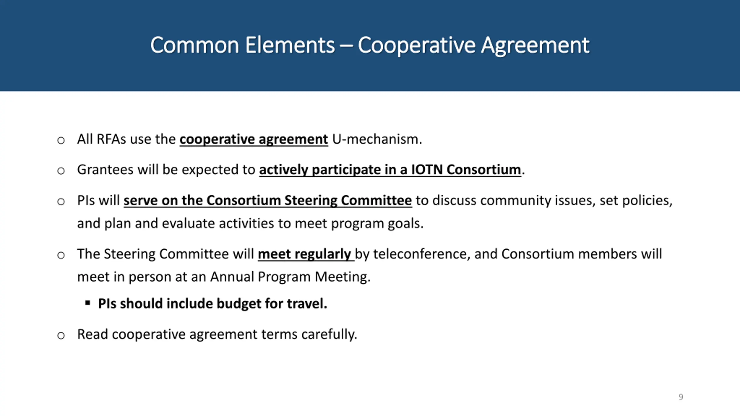 Common Elements Common Elements Cooperative Agreement Cooperative Agreement o All RFAs use the cooperative agreement U-mechanism. o Grantees will be expected to actively participate in a IOTN Consortium. o PIs will serve on the Consortium Steering Committee to discuss community issues, set policies, and plan and evaluate activities to meet program goals. o The Steering Committee will meet regularly by teleconference, and Consortium members will meet in person at an Annual Program Meeting. PIs should include budget for travel. o Read cooperative agreement terms carefully. 9