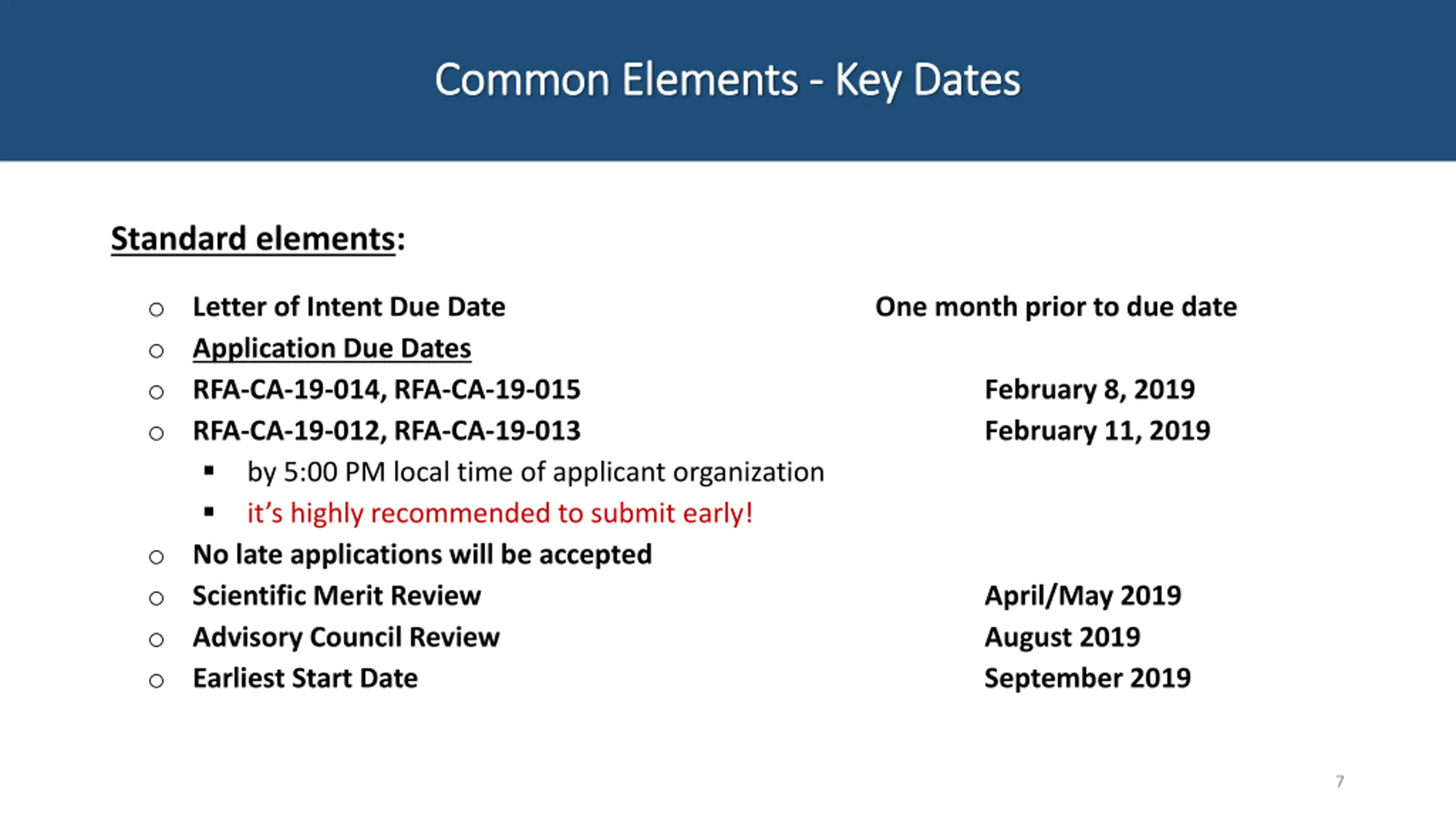 Common Elements Common Elements - - Key Dates Key Dates Standard elements: o Letter of Intent Due Date o Application Due Dates o RFA-CA-19-014, RFA-CA-19-015 o RFA-CA-19-012, RFA-CA-19-013 by 5:00 PM local time of applicant organization it s highly recommended to submit early! o No late applications will be accepted o Scientific Merit Review o Advisory Council Review o Earliest Start Date One month prior to due date February 8, 2019 February 11, 2019 April/May 2019 August 2019 September 2019 7