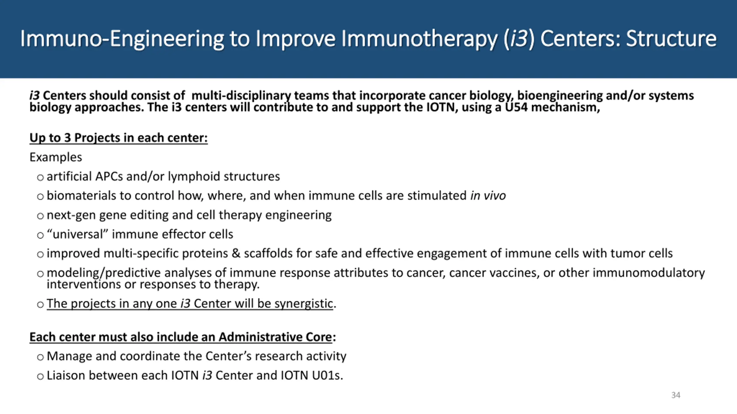 Immuno Immuno- -Engineering to Improve Immunotherapy ( Engineering to Improve Immunotherapy (i3 i3) Centers ) Centers Goal: o Support multi-disciplinary teams that incorporate bioengineering and systems biology approaches in the IOTN framework. o Quantitatively understand the physical basis of immune system function o Build predictive models o Regenerate compromised immune systems for therapeutic benefit o Enable precise control of desired immune responses that are more effective, safer, and more broadly available. 33 RFA-CA-19-013: Immuno-engineering to Improve Immunotherapy (i3) Centers (U54)