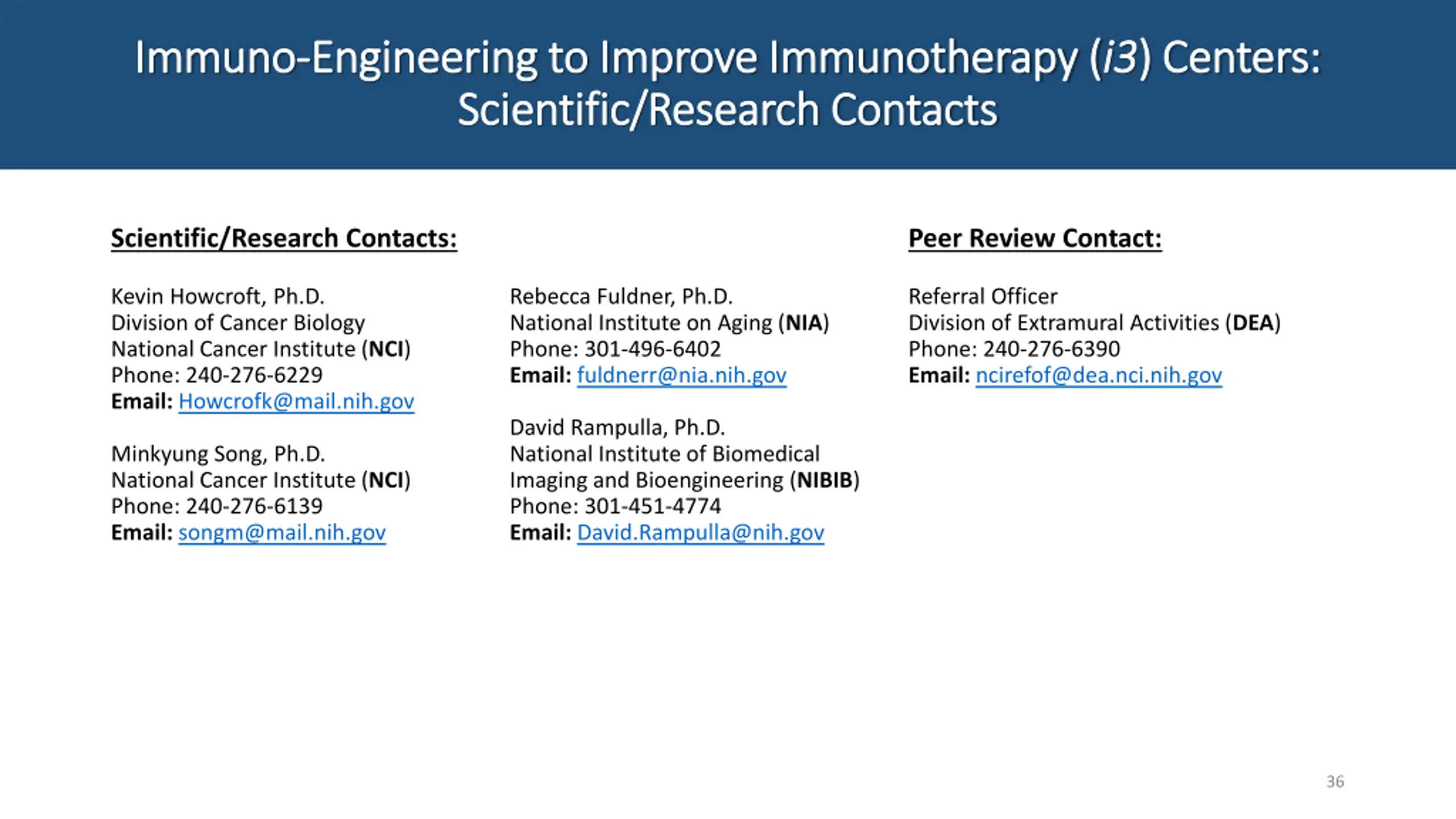 Immuno Immuno- -Engineering to Improve Immunotherapy ( Engineering to Improve Immunotherapy (i3 i3) Centers: Scientific/Research Contacts Scientific/Research Contacts ) Centers: Scientific/Research Contacts: Peer Review Contact: Kevin Howcroft, Ph.D. Division of Cancer Biology National Cancer Institute (NCI) Phone: 240-276-6229 Email: Howcrofk@mail.nih.gov Rebecca Fuldner, Ph.D. National Institute on Aging (NIA) Phone: 301-496-6402 Email: fuldnerr@nia.nih.gov Referral Officer Division of Extramural Activities (DEA) Phone: 240-276-6390 Email: ncirefof@dea.nci.nih.gov David Rampulla, Ph.D. National Institute of Biomedical Imaging and Bioengineering (NIBIB) Phone: 301-451-4774 Email: David.Rampulla@nih.gov Minkyung Song, Ph.D. National Cancer Institute (NCI) Phone: 240-276-6139 Email: songm@mail.nih.gov 36