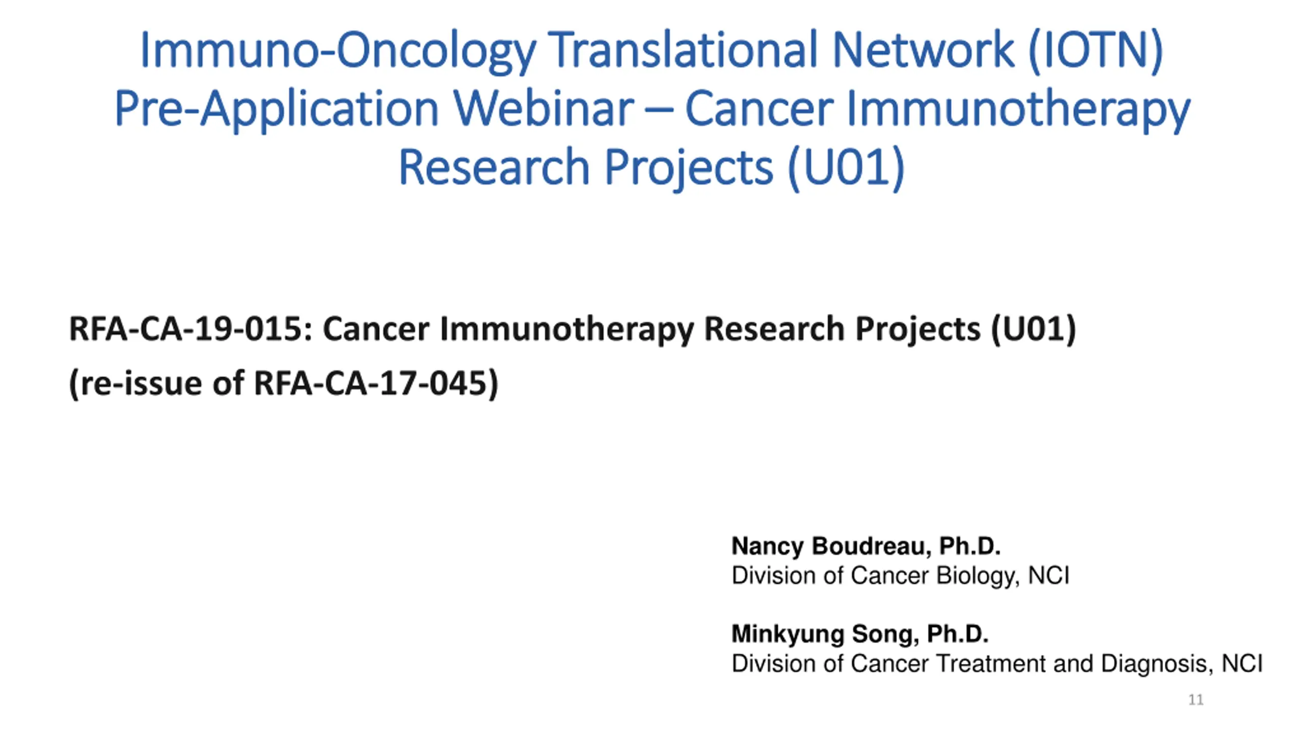 Immuno Immuno- -Oncology Translational Network (IOTN) Oncology Translational Network (IOTN) Pre Pre- -Application Webinar Application Webinar Cancer Immunotherapy Research Projects (U01) Research Projects (U01) Cancer Immunotherapy RFA-CA-19-015: Cancer Immunotherapy Research Projects (U01) (re-issue of RFA-CA-17-045) Nancy Boudreau, Ph.D. Division of Cancer Biology, NCI Minkyung Song, Ph.D. Division of Cancer Treatment and Diagnosis, NCI 11