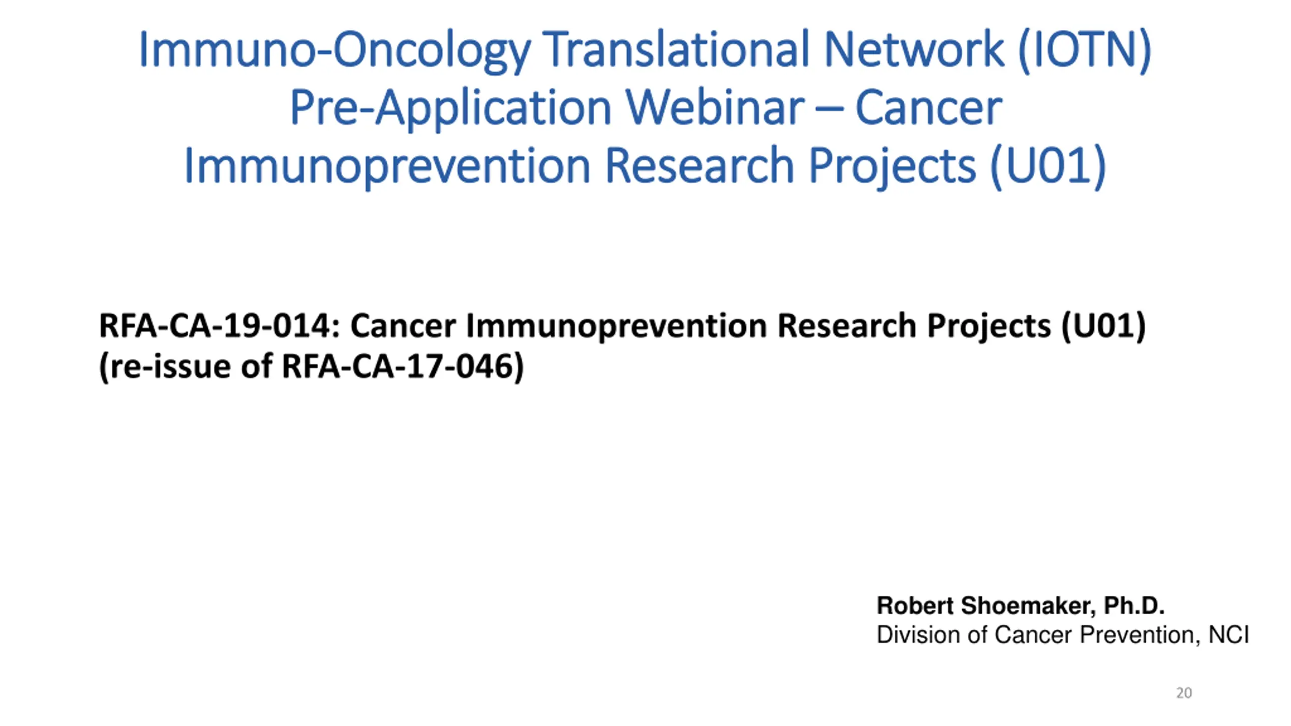 Immuno Immuno- -Oncology Translational Network (IOTN) Oncology Translational Network (IOTN) Pre Pre- -Application Webinar Application Webinar Cancer Immunoprevention Research Projects (U01) Immunoprevention Research Projects (U01) Cancer RFA-CA-19-014: Cancer Immunoprevention Research Projects (U01) (re-issue of RFA-CA-17-046) Robert Shoemaker, Ph.D. Division of Cancer Prevention, NCI 20