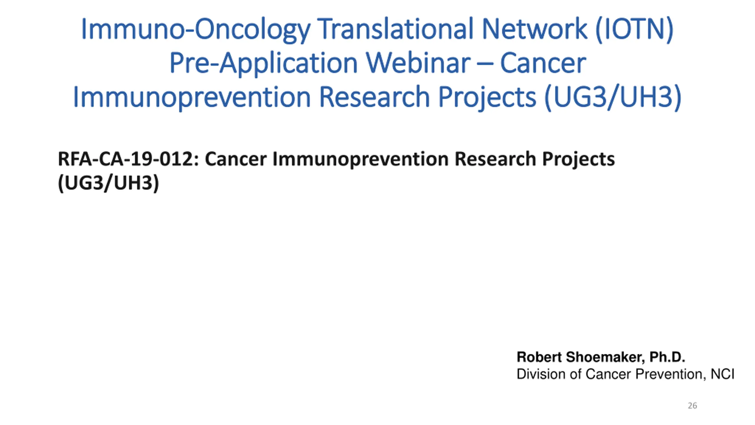 Immuno Immuno- -Oncology Translational Network (IOTN) Oncology Translational Network (IOTN) Pre Pre- -Application Webinar Application Webinar Cancer Immunoprevention Research Projects (UG3/UH3) Immunoprevention Research Projects (UG3/UH3) Cancer RFA-CA-19-012: Cancer Immunoprevention Research Projects (UG3/UH3) Robert Shoemaker, Ph.D. Division of Cancer Prevention, NCI 26