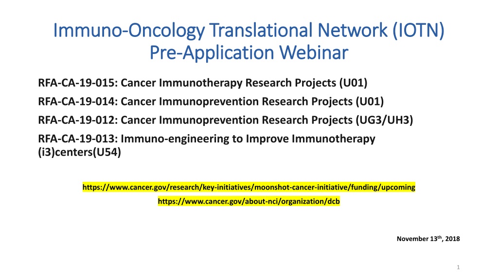 Immuno Immuno- -Oncology Translational Network (IOTN) Oncology Translational Network (IOTN) Pre Pre- -Application Webinar Application Webinar RFA-CA-19-015: Cancer Immunotherapy Research Projects (U01) RFA-CA-19-014: Cancer Immunoprevention Research Projects (U01) RFA-CA-19-012: Cancer Immunoprevention Research Projects (UG3/UH3) RFA-CA-19-013: Immuno-engineering to Improve Immunotherapy (i3)centers(U54) https://www.cancer.gov/research/key-initiatives/moonshot-cancer-initiative/funding/upcoming https://www.cancer.gov/about-nci/organization/dcb November 13th, 2018 1