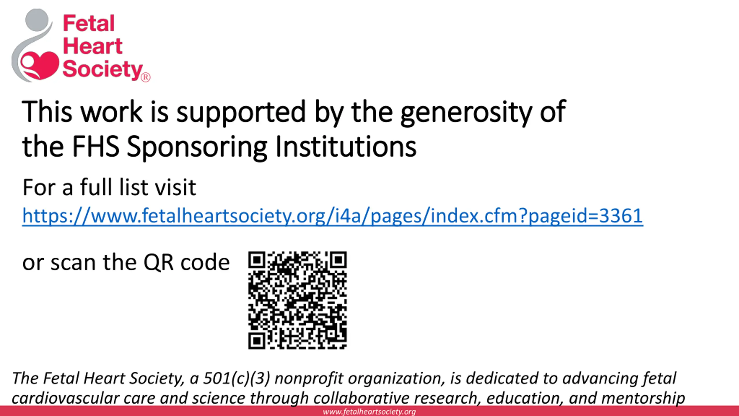 This work is supported by the generosity of This work is supported by the generosity of the FHS Sponsoring Institutions the FHS Sponsoring Institutions For a full list visit https://www.fetalheartsociety.org/i4a/pages/index.cfm?pageid=3361 or scan the QR code The Fetal Heart Society, a 501(c)(3) nonprofit organization, is dedicated to advancing fetal cardiovascular care and science through collaborative research, education, and mentorship www.fetalheartsociety.org