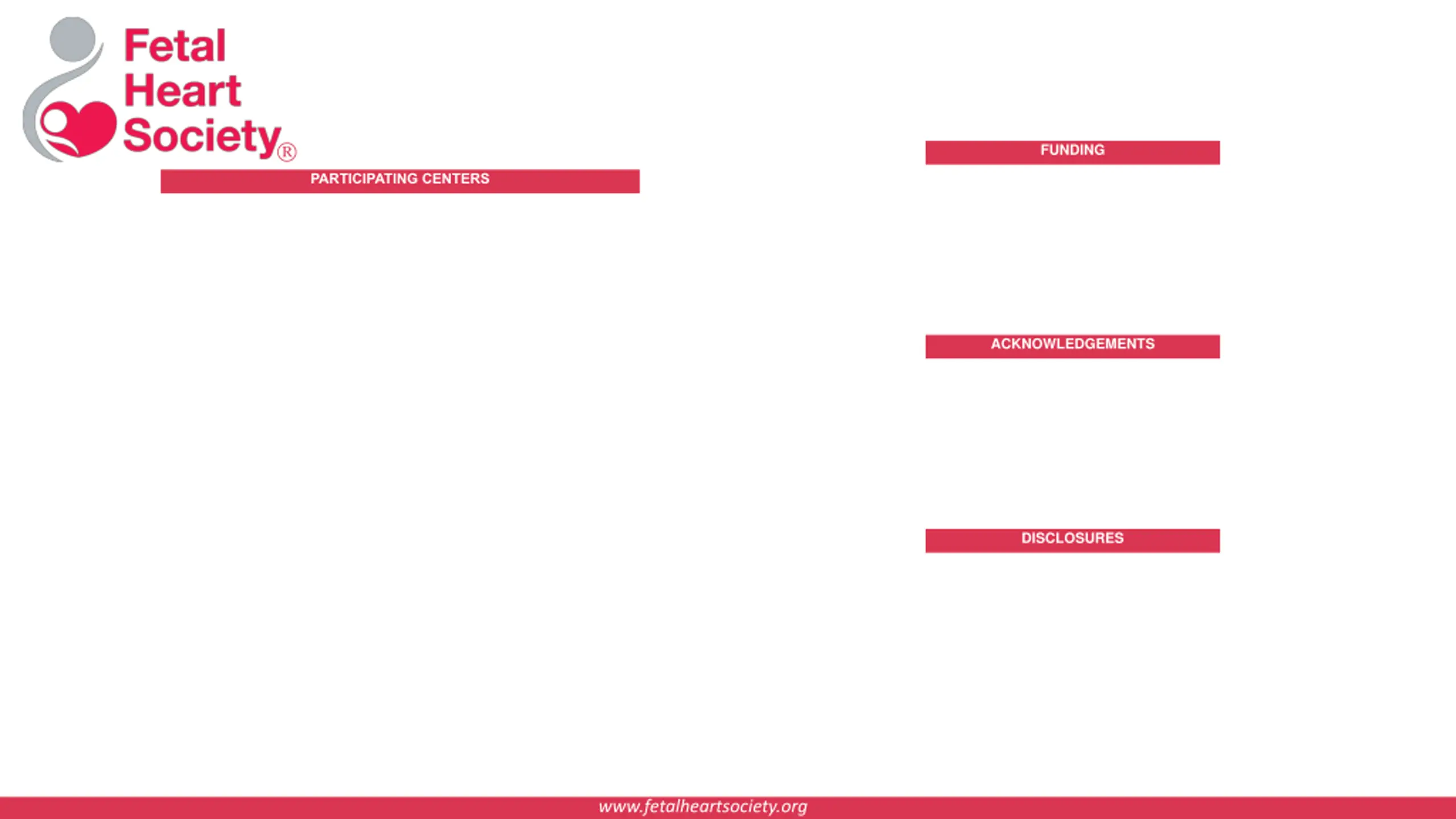 FUNDING PARTICIPATING CENTERS ACKNOWLEDGEMENTS DISCLOSURES The Fetal Heart Society is a 501(c) nonprofit formed to advance the field of fetal cardiovascular care & science through collaborative research, education and mentorship and is sponsored by: www.fetalheartsociety.org