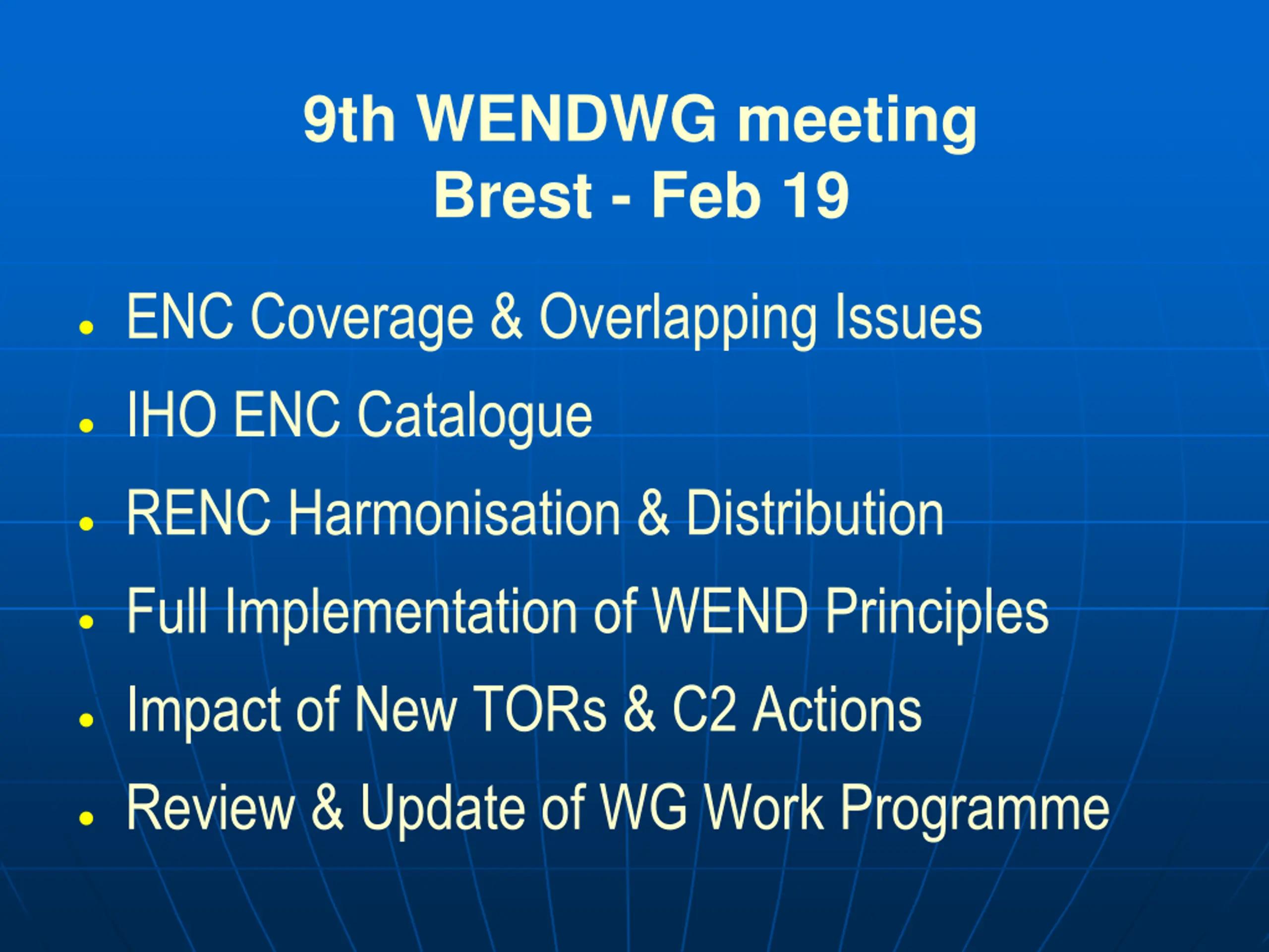 9th WENDWG meeting Brest - Feb 19 ENC Coverage & Overlapping Issues IHO ENC Catalogue RENC Harmonisation & Distribution Full Implementation of WEND Principles Impact of New TORs & C2 Actions Review & Update of WG Work Programme