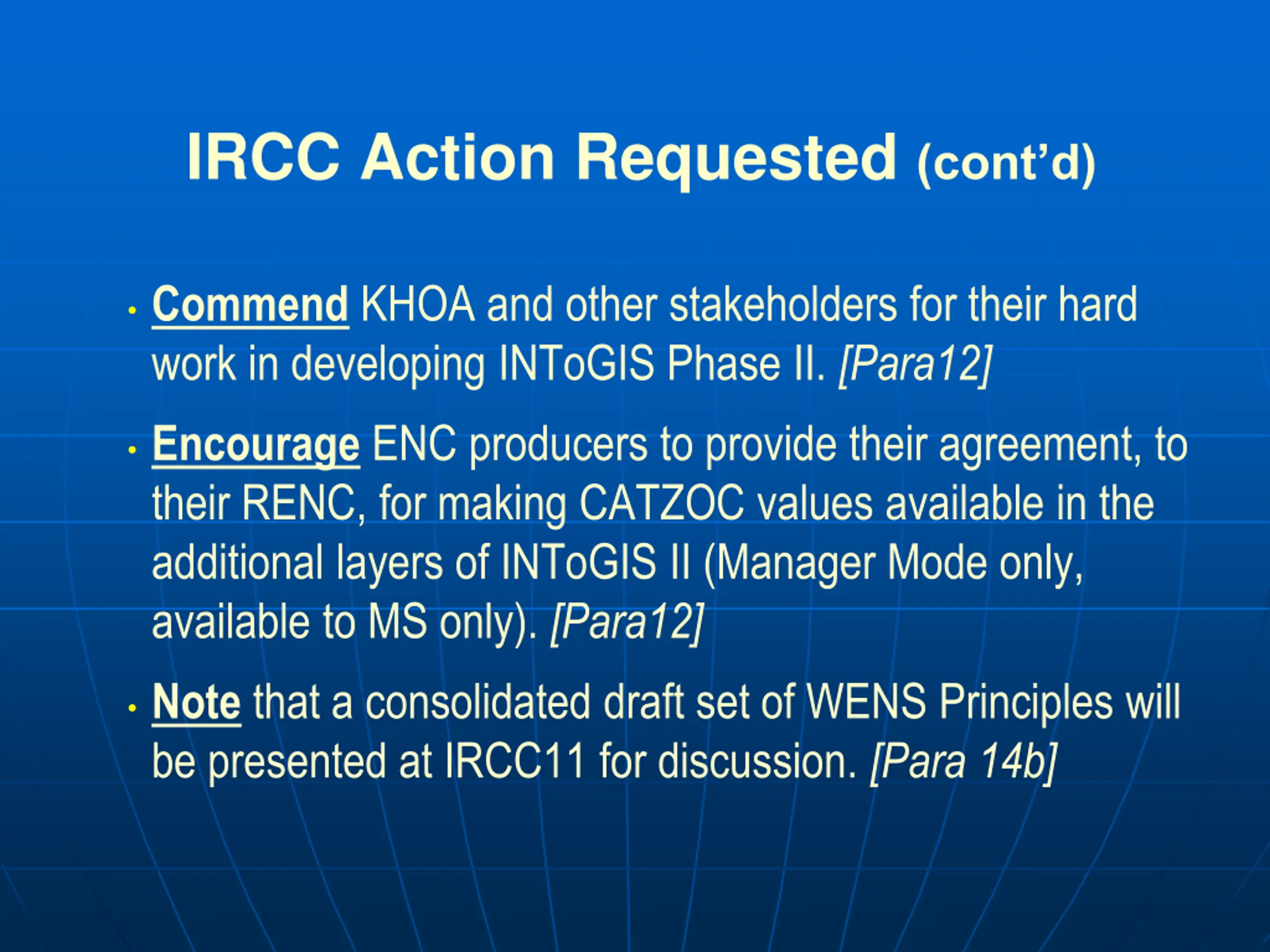 IRCC Action Requested (contd) Commend KHOA and other stakeholders for their hard work in developing INToGIS Phase II. [Para12] Encourage ENC producers to provide their agreement, to their RENC, for making CATZOC values available in the additional layers of INToGIS II (Manager Mode only, available to MS only). [Para12] Note that a consolidated draft set of WENS Principles will be presented at IRCC11 for discussion. [Para 14b]