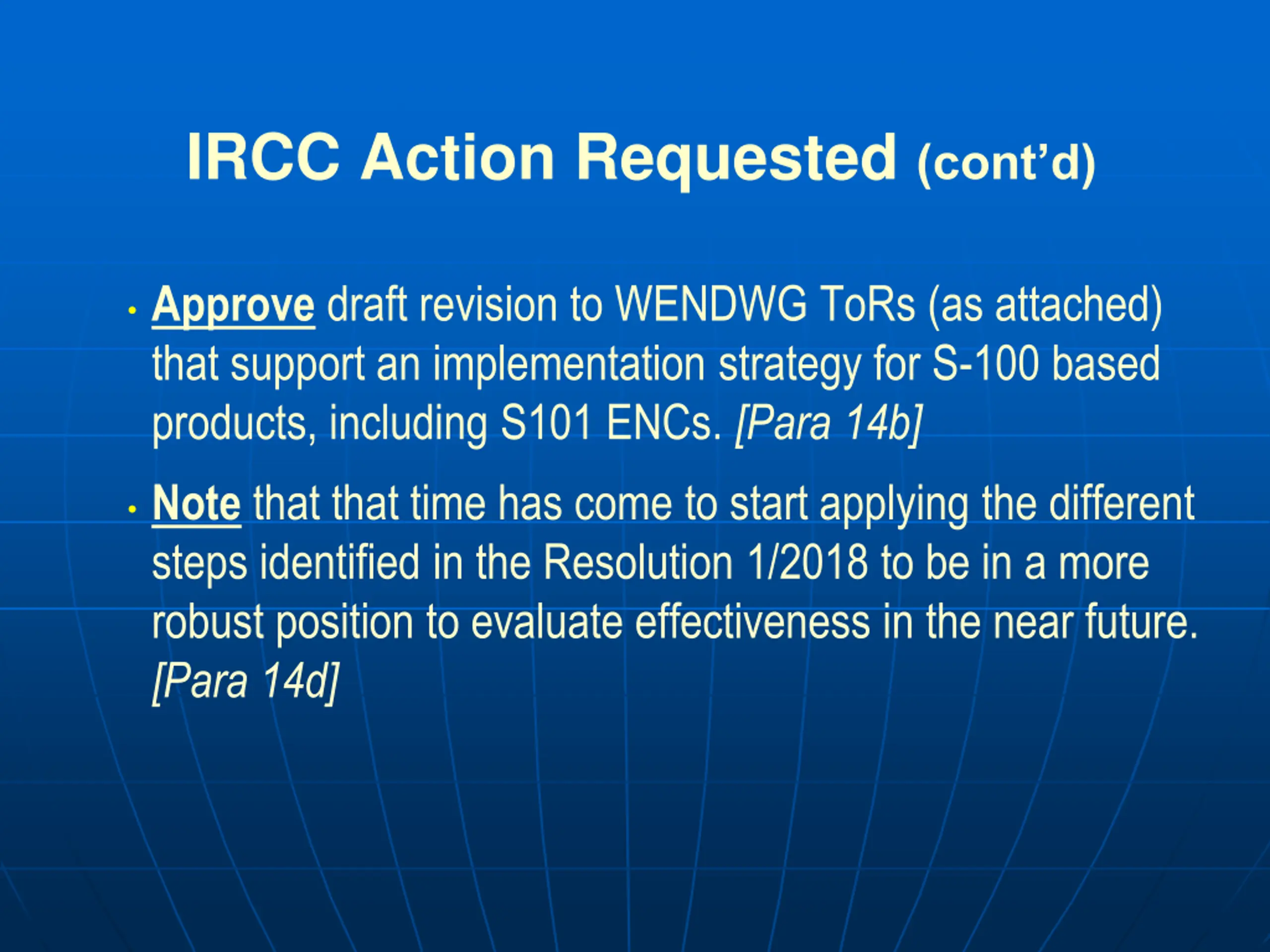 IRCC Action Requested (contd) Approve draft revision to WENDWG ToRs (as attached) that support an implementation strategy for S-100 based products, including S101 ENCs. [Para 14b] Note that that time has come to start applying the different steps identified in the Resolution 1/2018 to be in a more robust position to evaluate effectiveness in the near future. [Para 14d]