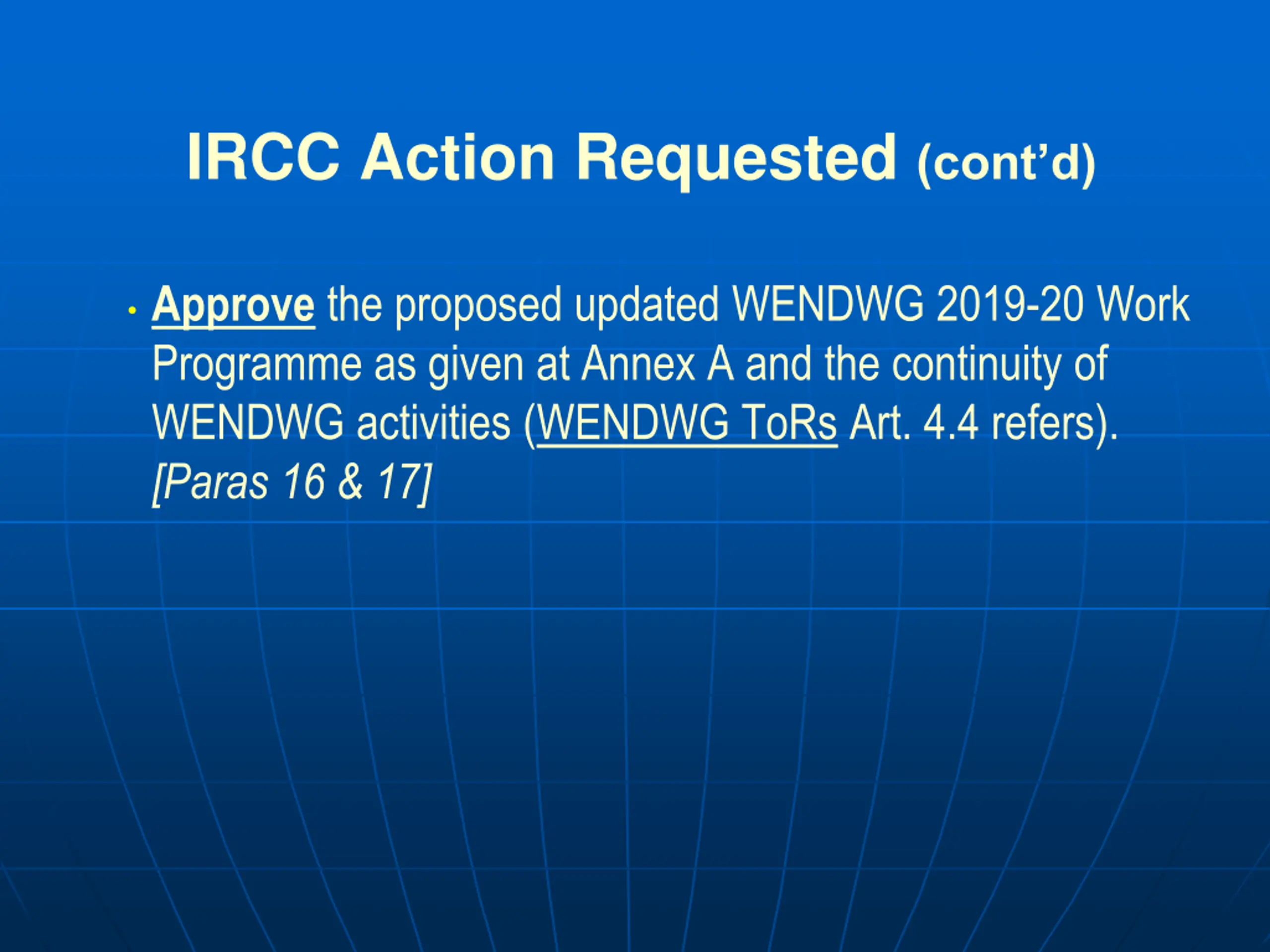 IRCC Action Requested (contd) Approve the proposed updated WENDWG 2019-20 Work Programme as given at Annex A and the continuity of WENDWG activities (WENDWG ToRs Art. 4.4 refers). [Paras 16 & 17]