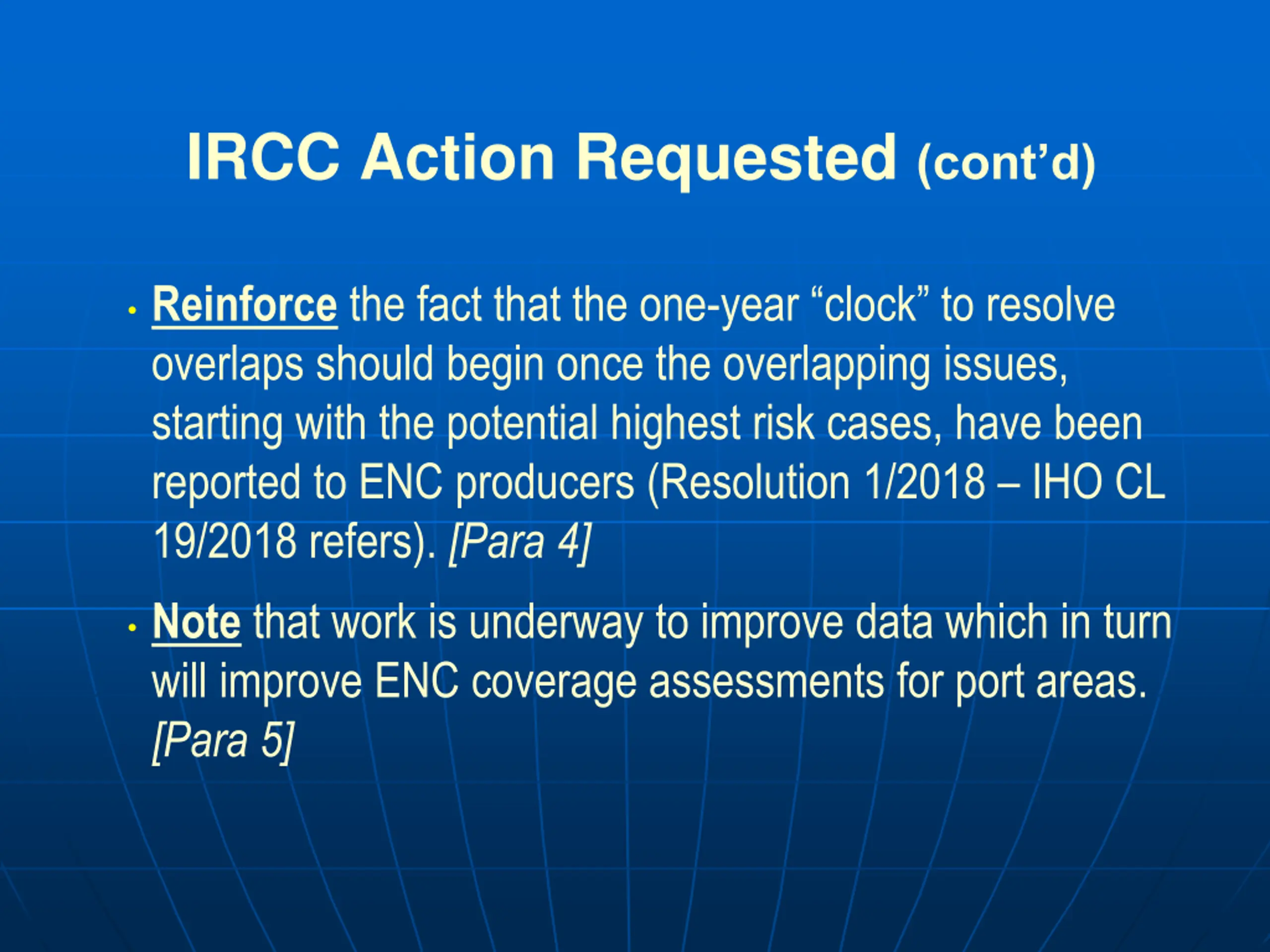 IRCC Action Requested (contd) Reinforce the fact that the one-year clock to resolve overlaps should begin once the overlapping issues, starting with the potential highest risk cases, have been reported to ENC producers (Resolution 1/2018 IHO CL 19/2018 refers). [Para 4] Note that work is underway to improve data which in turn will improve ENC coverage assessments for port areas. [Para 5]