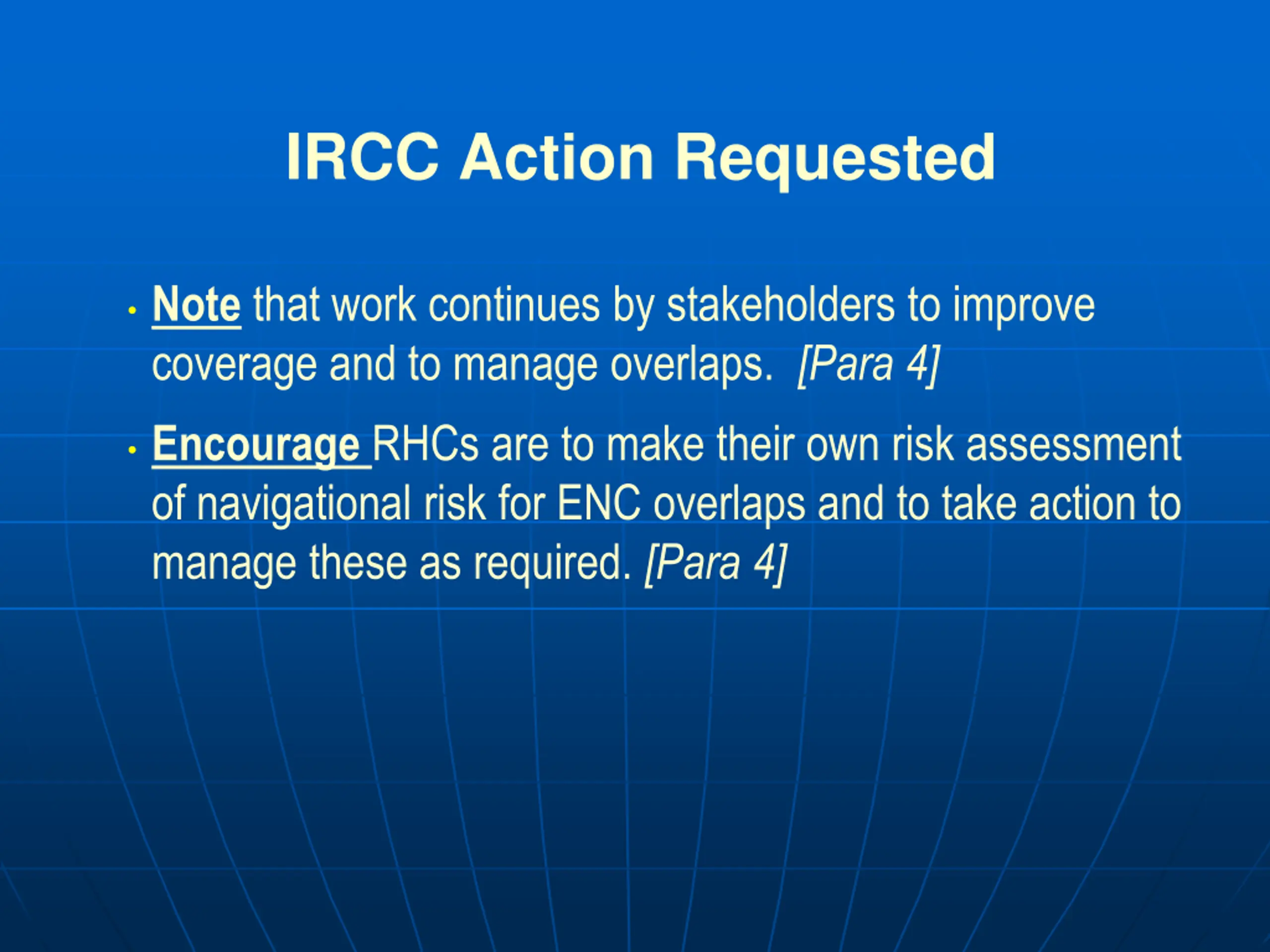 IRCC Action Requested Note that work continues by stakeholders to improve coverage and to manage overlaps. [Para 4] Encourage RHCs are to make their own risk assessment of navigational risk for ENC overlaps and to take action to manage these as required. [Para 4]