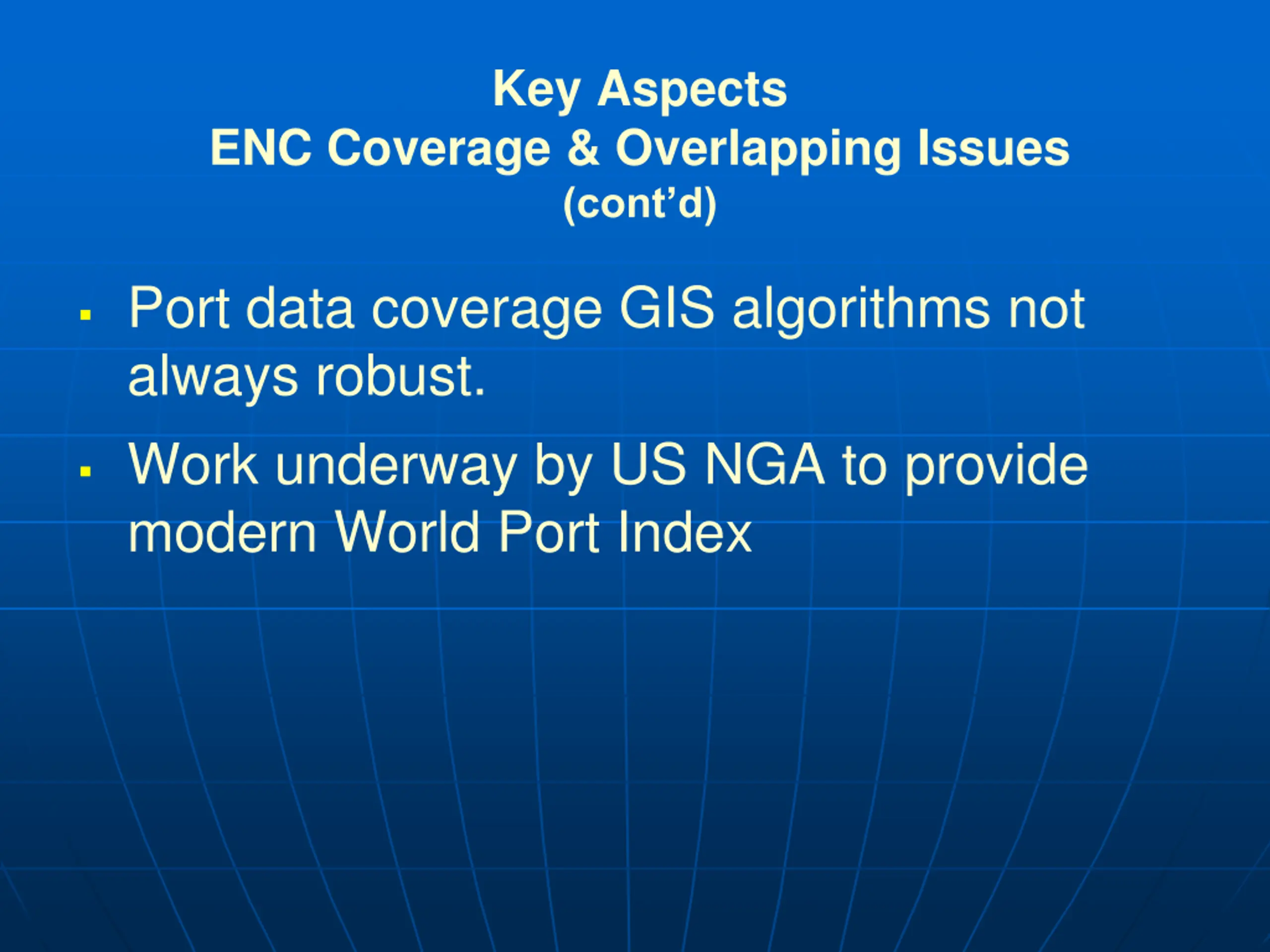 Key Aspects ENC Coverage & Overlapping Issues (cont d) Port data coverage GIS algorithms not always robust. Work underway by US NGA to provide modern World Port Index