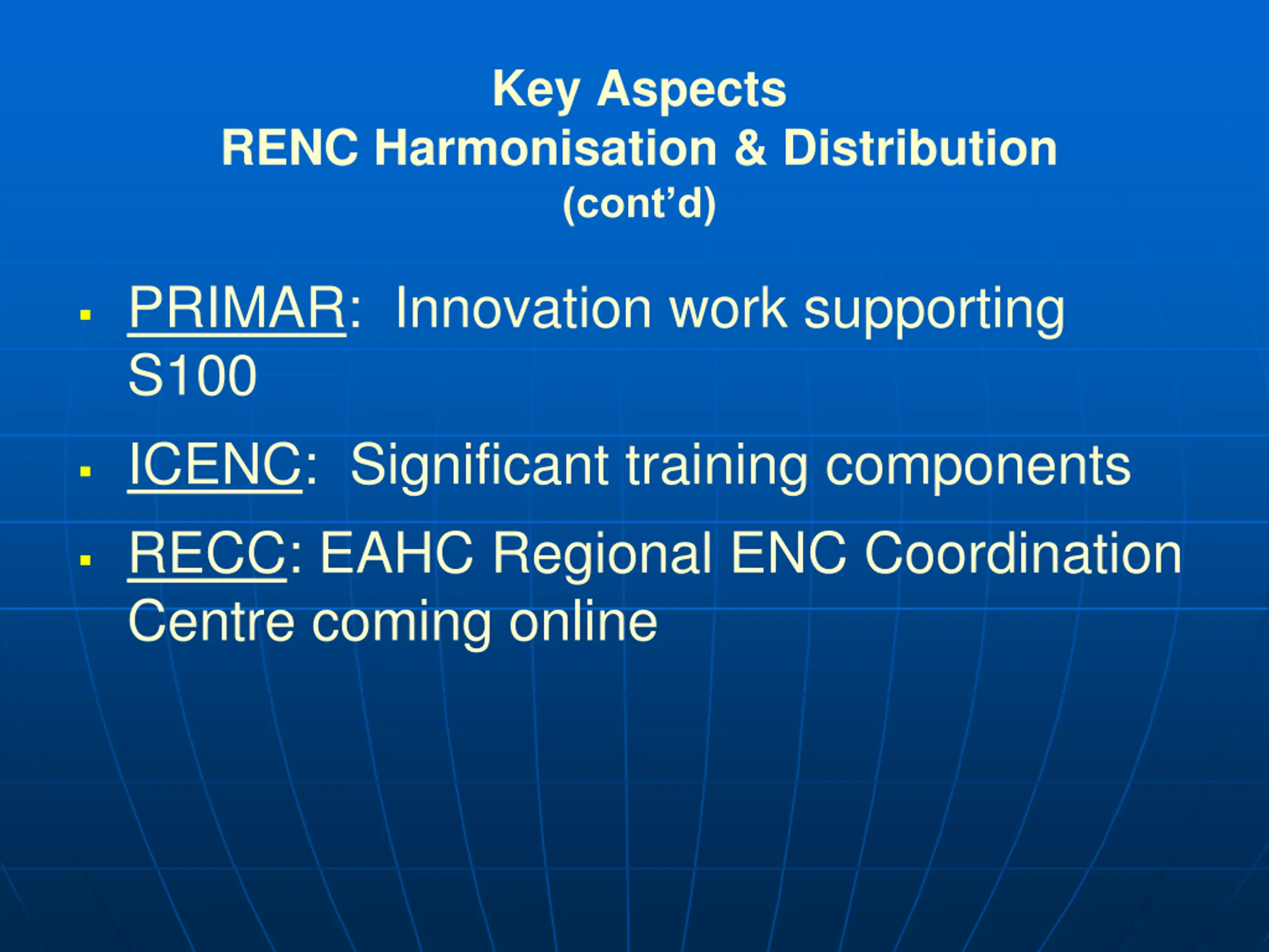 Key Aspects RENC Harmonisation & Distribution (cont d) PRIMAR: Innovation work supporting S100 ICENC: Significant training components RECC: EAHC Regional ENC Coordination Centre coming online
