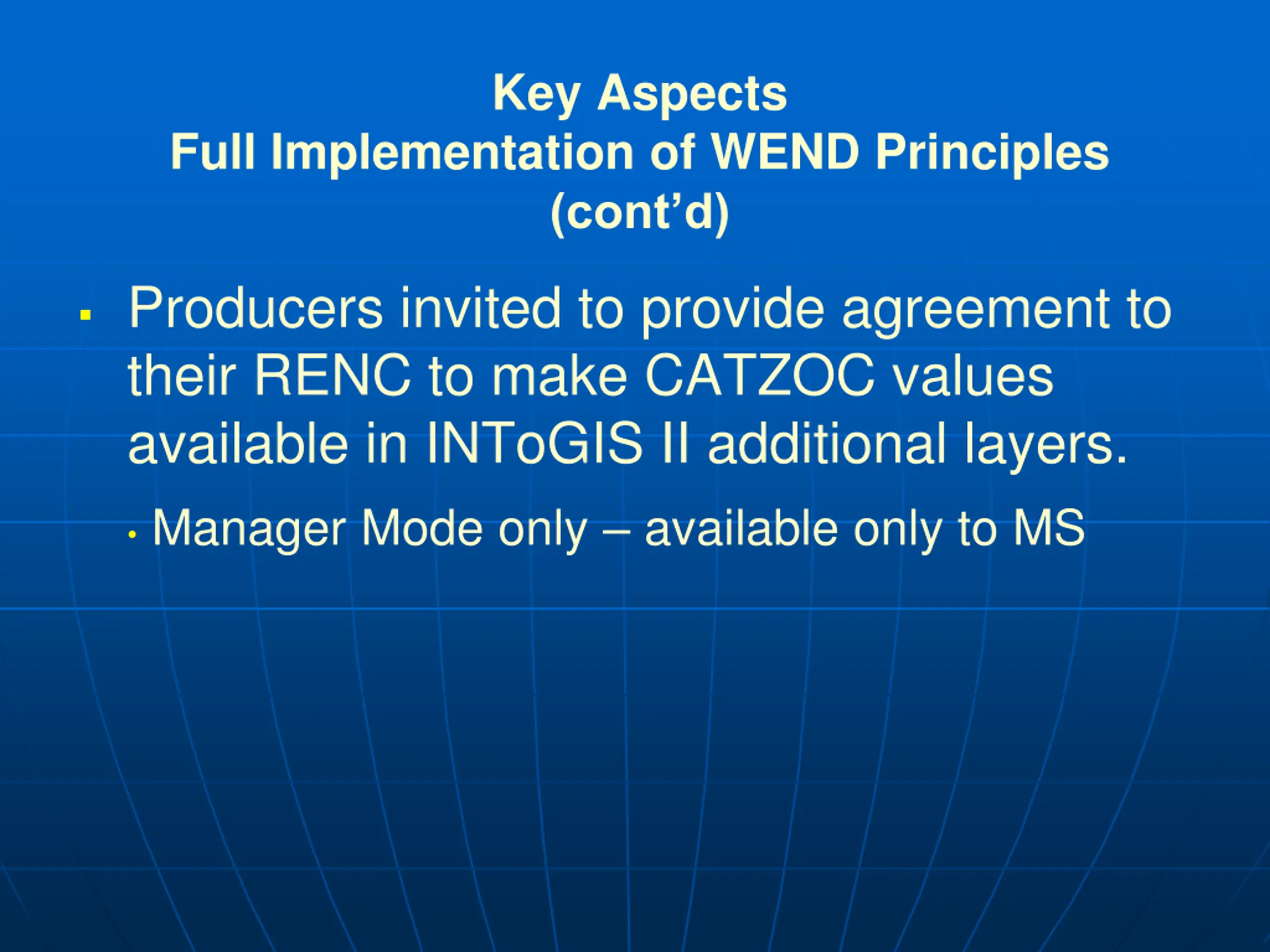 Key Aspects Full Implementation of WEND Principles (cont d) Producers invited to provide agreement to their RENC to make CATZOC values available in INToGIS II additional layers. Manager Mode only available only to MS