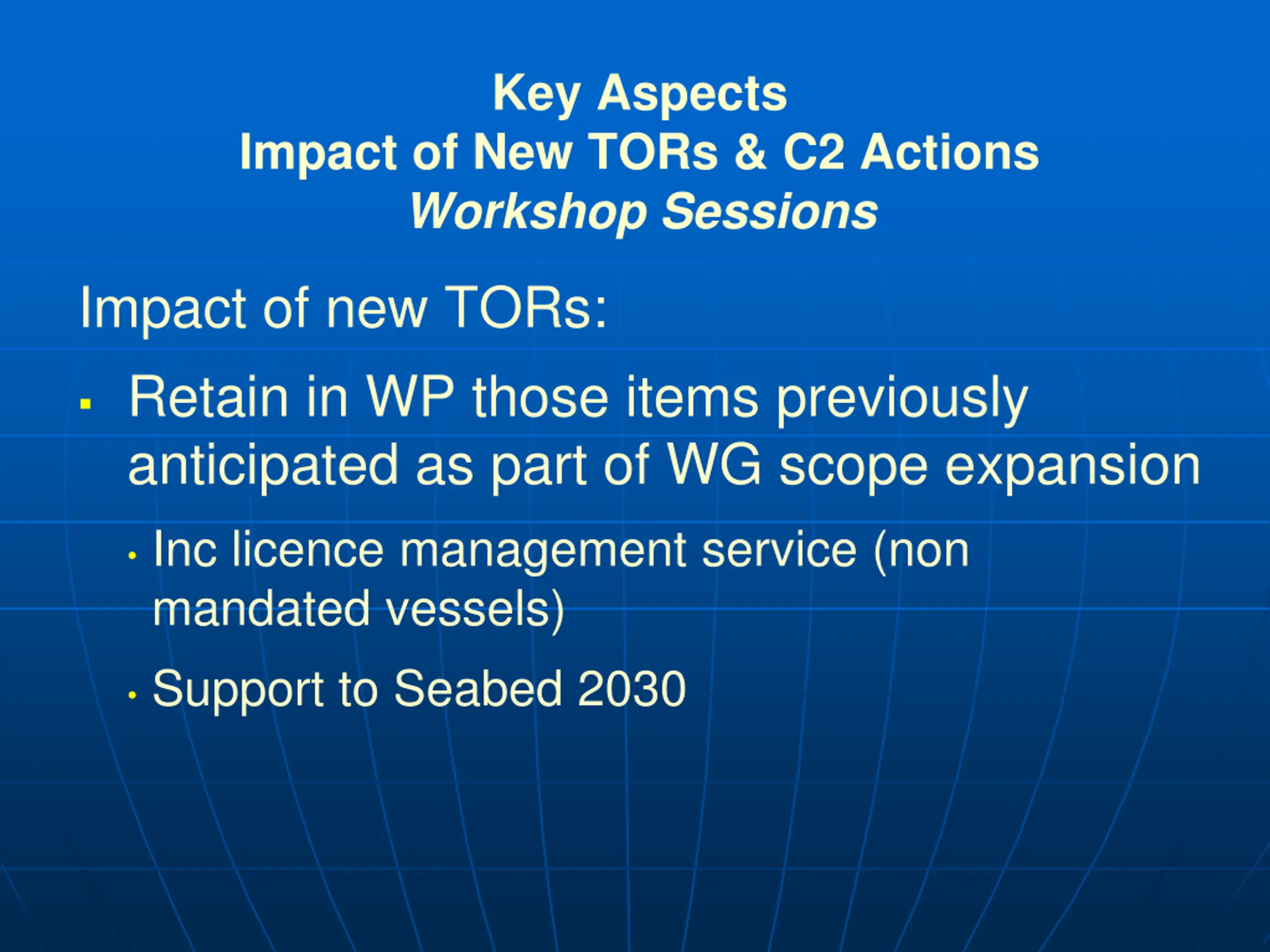 Key Aspects Impact of New TORs & C2 Actions Workshop Sessions Impact of new TORs: Retain in WP those items previously anticipated as part of WG scope expansion Inc licence management service (non mandated vessels) Support to Seabed 2030