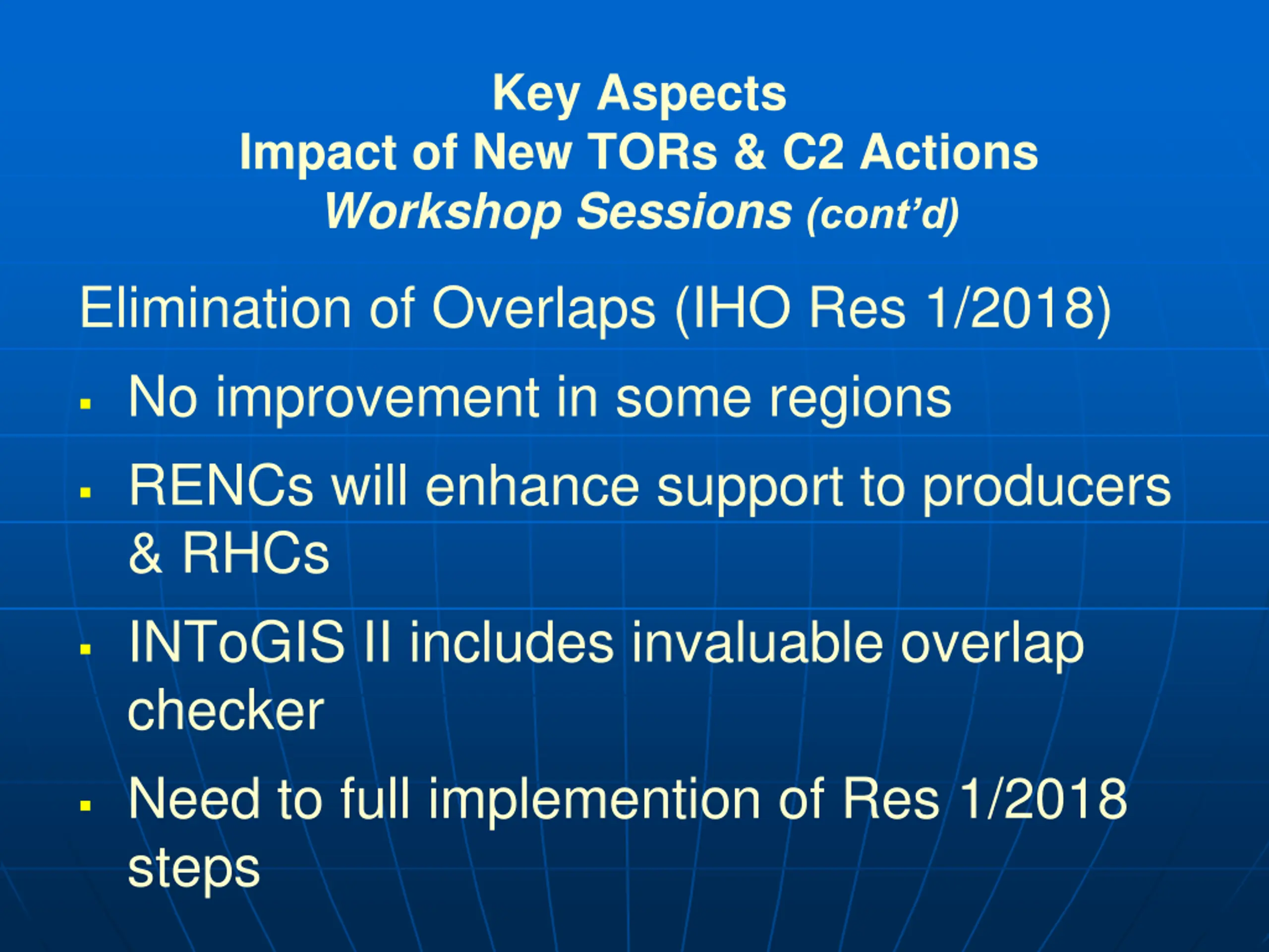 Key Aspects Impact of New TORs & C2 Actions Workshop Sessions (cont d) Elimination of Overlaps (IHO Res 1/2018) No improvement in some regions RENCs will enhance support to producers & RHCs INToGIS II includes invaluable overlap checker Need to full implemention of Res 1/2018 steps