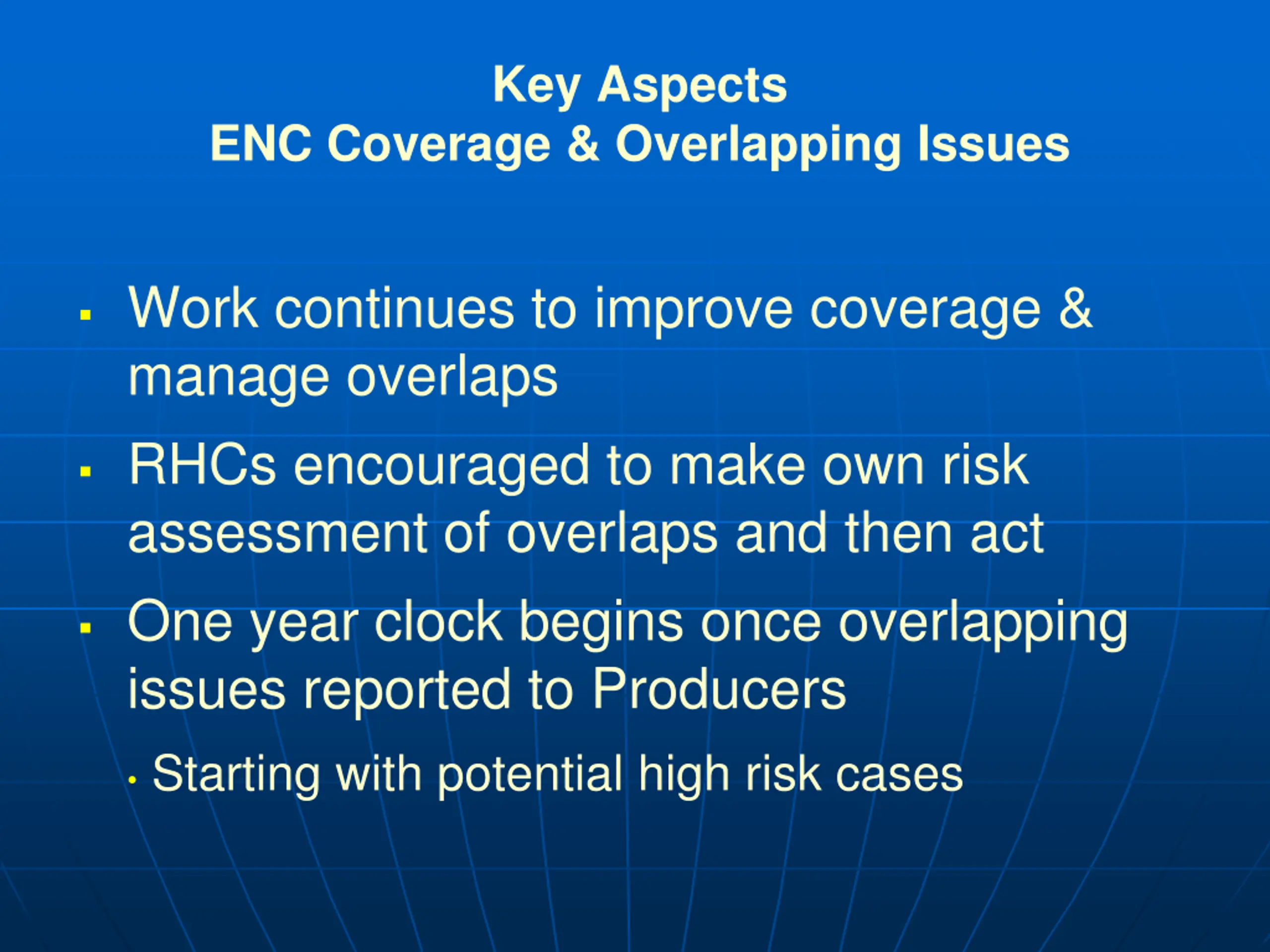 Key Aspects ENC Coverage & Overlapping Issues Work continues to improve coverage & manage overlaps RHCs encouraged to make own risk assessment of overlaps and then act One year clock begins once overlapping issues reported to Producers Starting with potential high risk cases