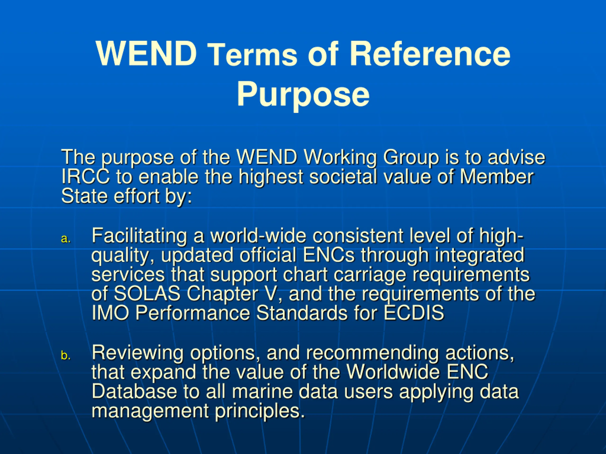 WEND Terms of Reference Purpose The purpose of the WEND Working Group is to advise IRCC to enable the highest societal value of Member State effort by: Facilitating a world-wide consistent level of high- quality, updated official ENCs through integrated services that support chart carriage requirements of SOLAS Chapter V, and the requirements of the IMO Performance Standards for ECDIS a. Reviewing options, and recommending actions, that expand the value of the Worldwide ENC Database to all marine data users applying data management principles. b.