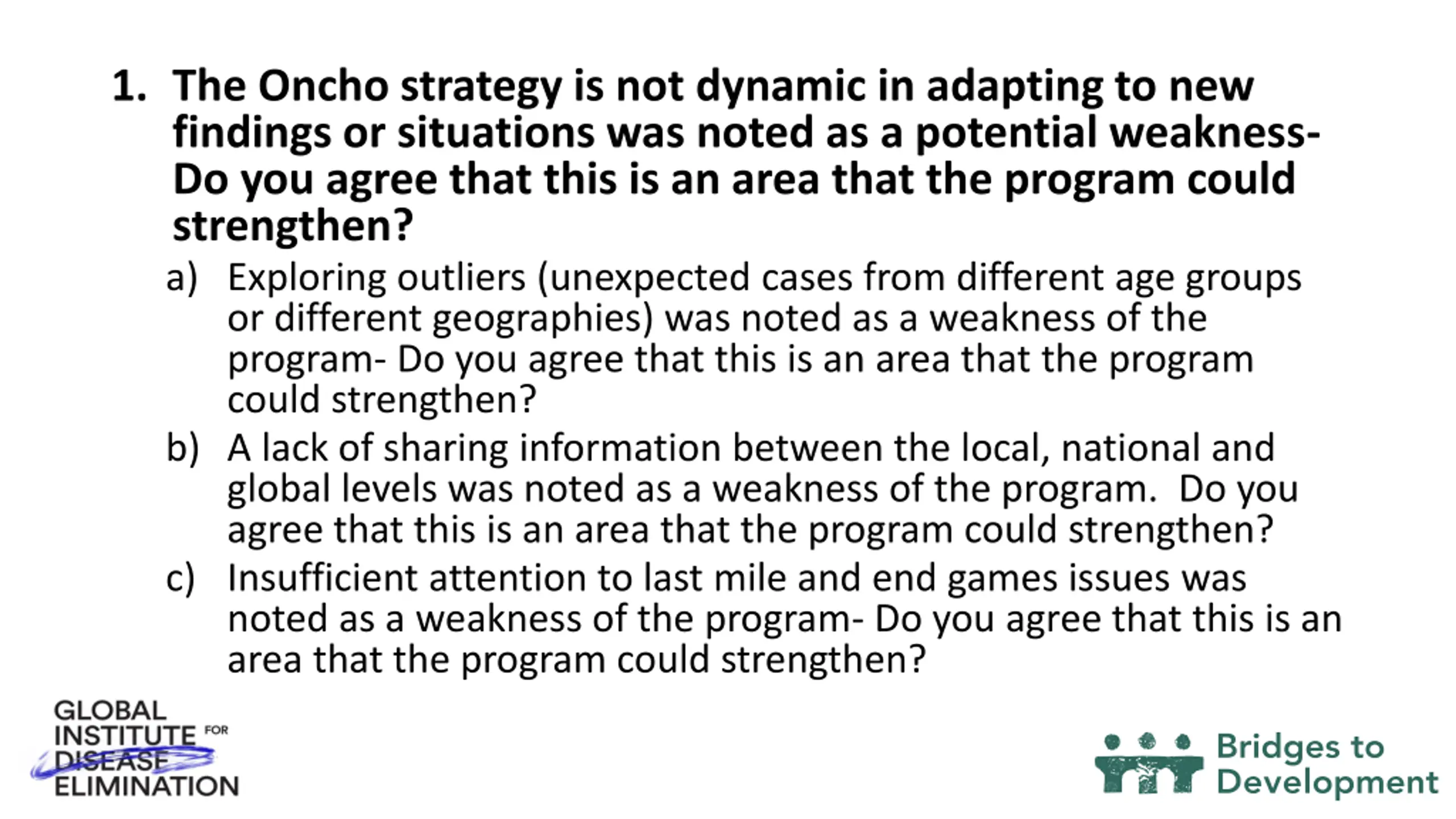1. The Oncho strategy is not dynamic in adapting to new findings or situations was noted as a potential weakness- Do you agree that this is an area that the program could strengthen? a) Exploring outliers (unexpected cases from different age groups or different geographies) was noted as a weakness of the program- Do you agree that this is an area that the program could strengthen? b) A lack of sharing information between the local, national and global levels was noted as a weakness of the program. Do you agree that this is an area that the program could strengthen? c) Insufficient attention to last mile and end games issues was noted as a weakness of the program- Do you agree that this is an area that the program could strengthen?