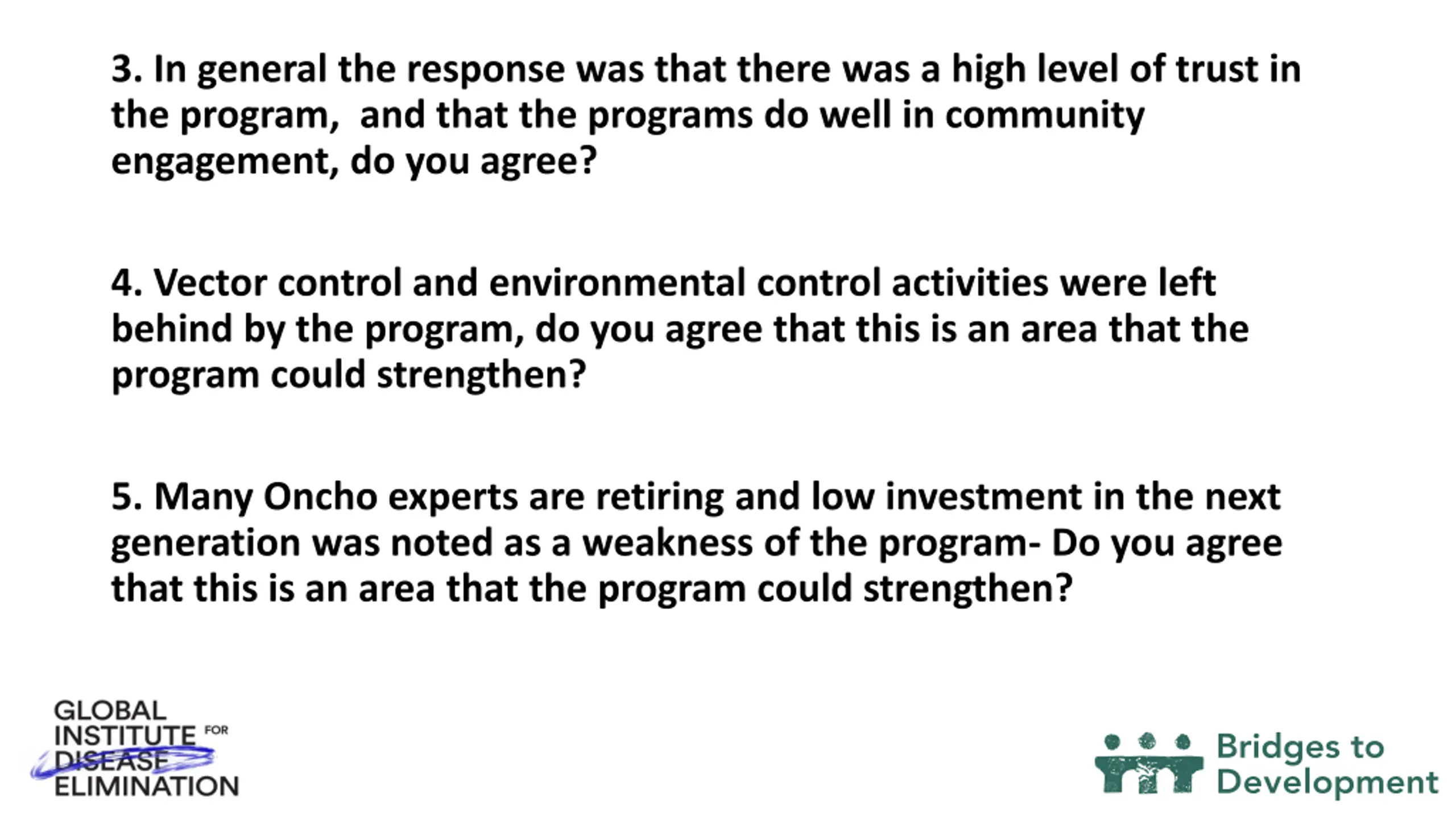 3. In general the response was that there was a high level of trust in the program, and that the programs do well in community engagement, do you agree? 4. Vector control and environmental control activities were left behind by the program, do you agree that this is an area that the program could strengthen? 5. Many Oncho experts are retiring and low investment in the next generation was noted as a weakness of the program-Do you agree that this is an area that the program could strengthen?