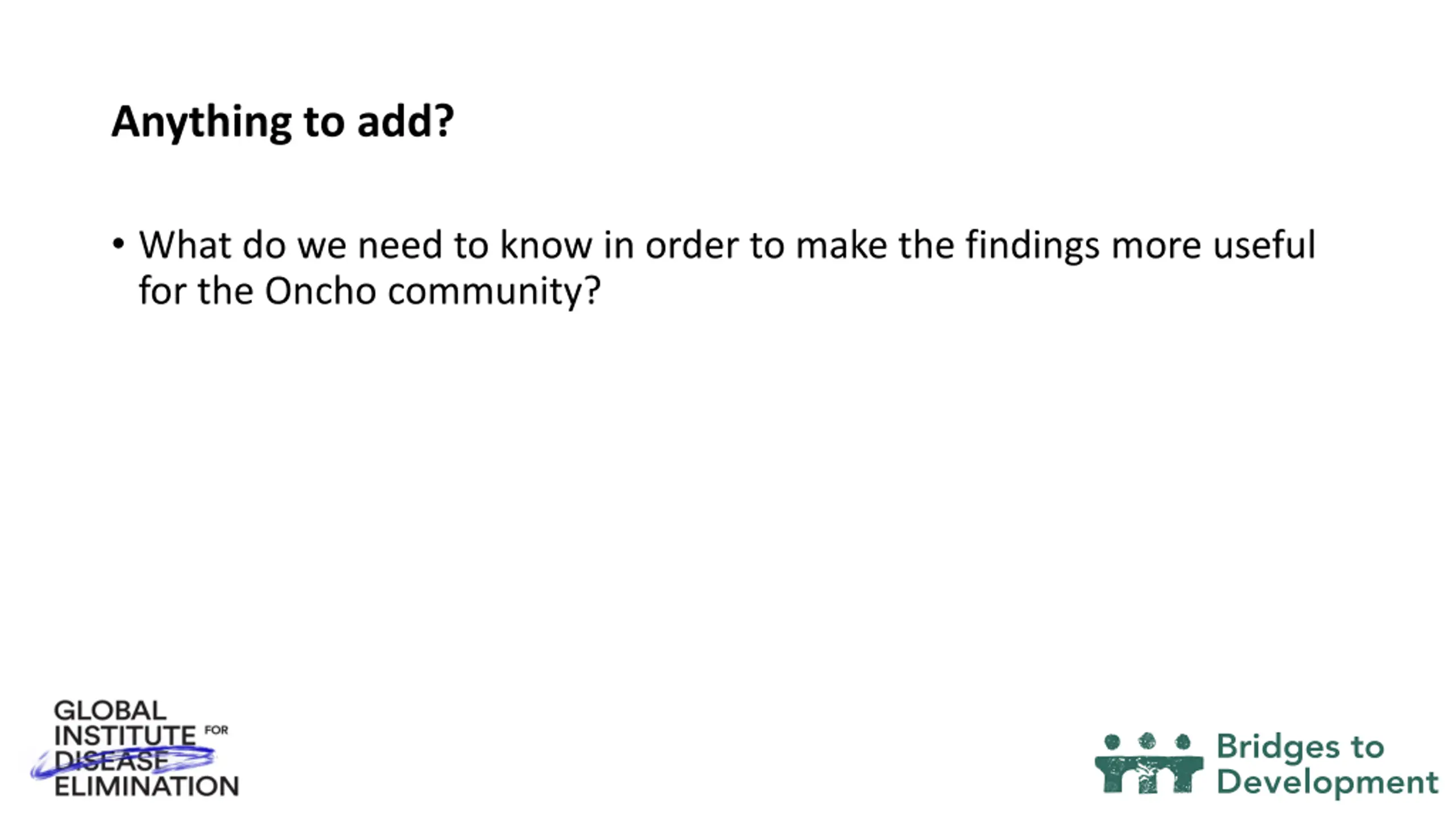 Anything to add? What do we need to know in order to make the findings more useful for the Oncho community?