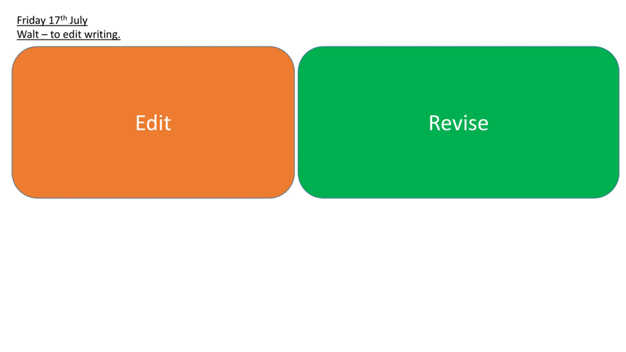 Friday 17th July Walt to edit writing. EDIT Spelling Punctuation full stops, commas, capital letters semi colons, colons, brackets, dashes Sentences make sense (no words missing or additional words added in). Sentences are in correct tense (past or present) Writing stays in 1st, 2nd, or 3rd person and is consistent throughout. REVISE Change word choices to improve them (e.g. big colossal). Add words (adjectives, adverbs) to sentences to improve them. Remove words or sentences that you feel are not needed. Move sentences around to fit better within your story. Add more detail to a sentence to give the reader a better understanding. Edit Revise