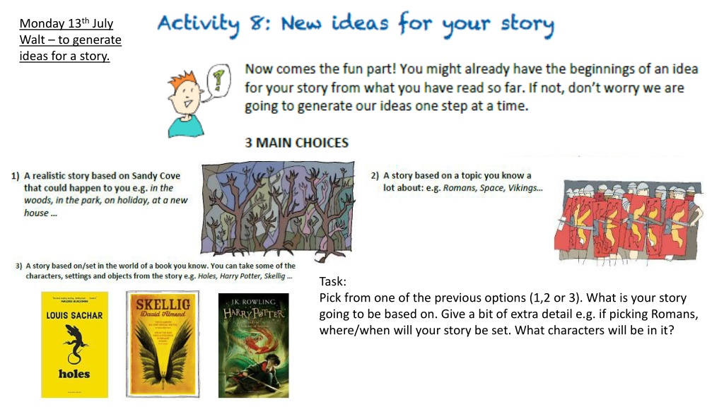 Monday 13th July Walt to generate ideas for a story. Task: Pick from one of the previous options (1,2 or 3). What is your story going to be based on. Give a bit of extra detail e.g. if picking Romans, where/when will your story be set. What characters will be in it?