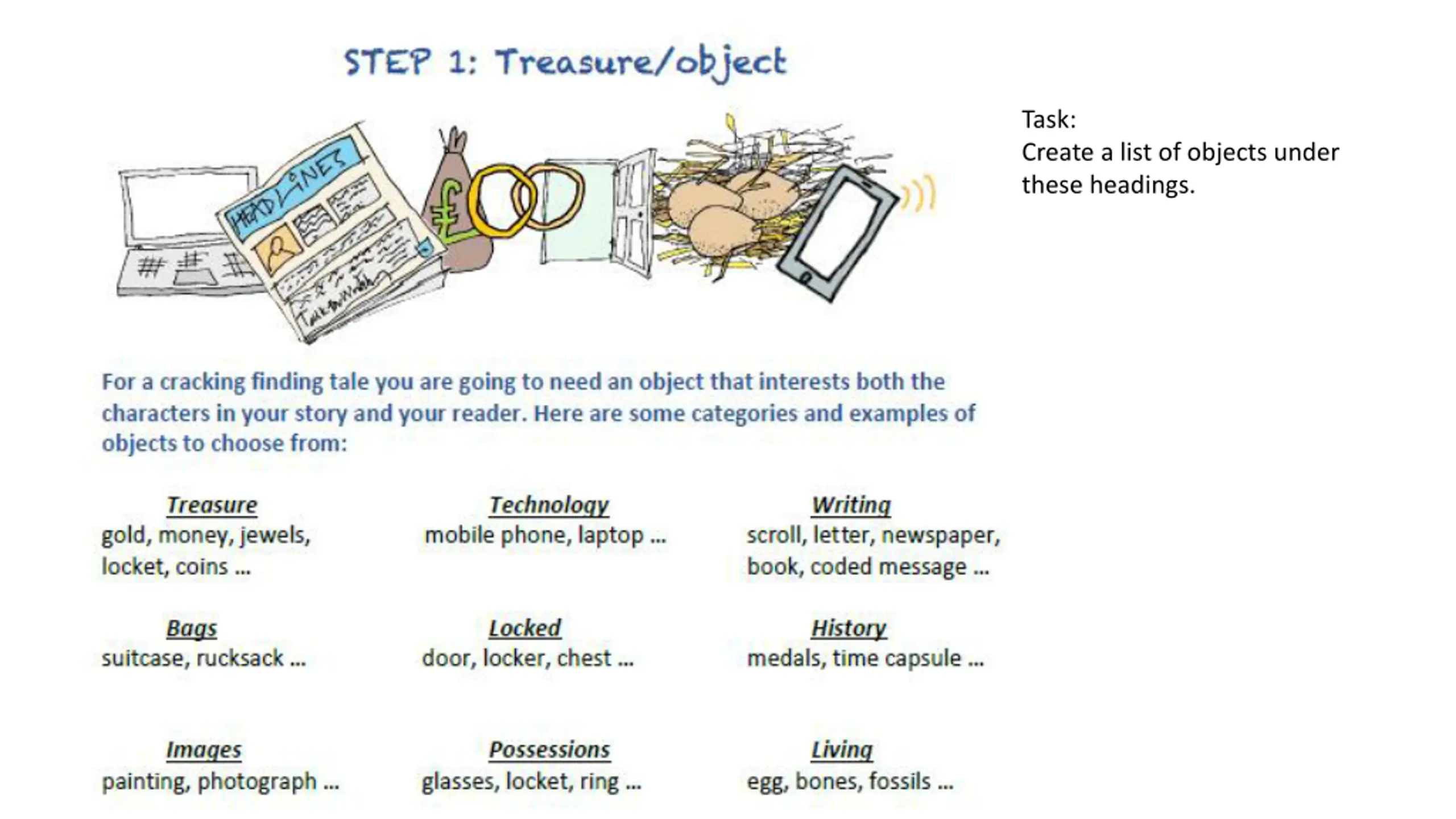 Task: list ideas for each of these steps. These do not have to be your final choices but will help you when you come to plan. Example: Setting Woods, forest, trees, jungle, abandoned hut etc