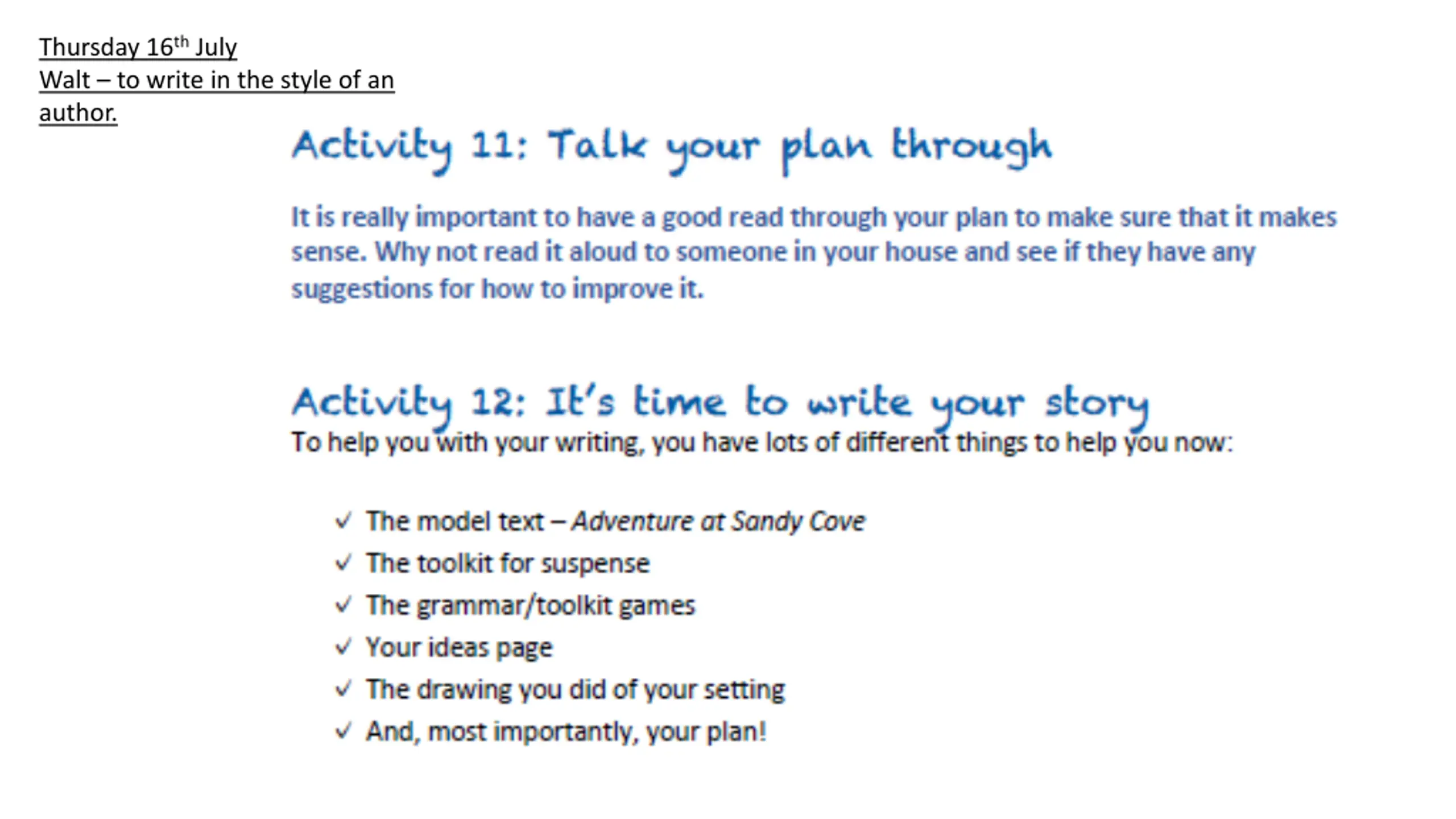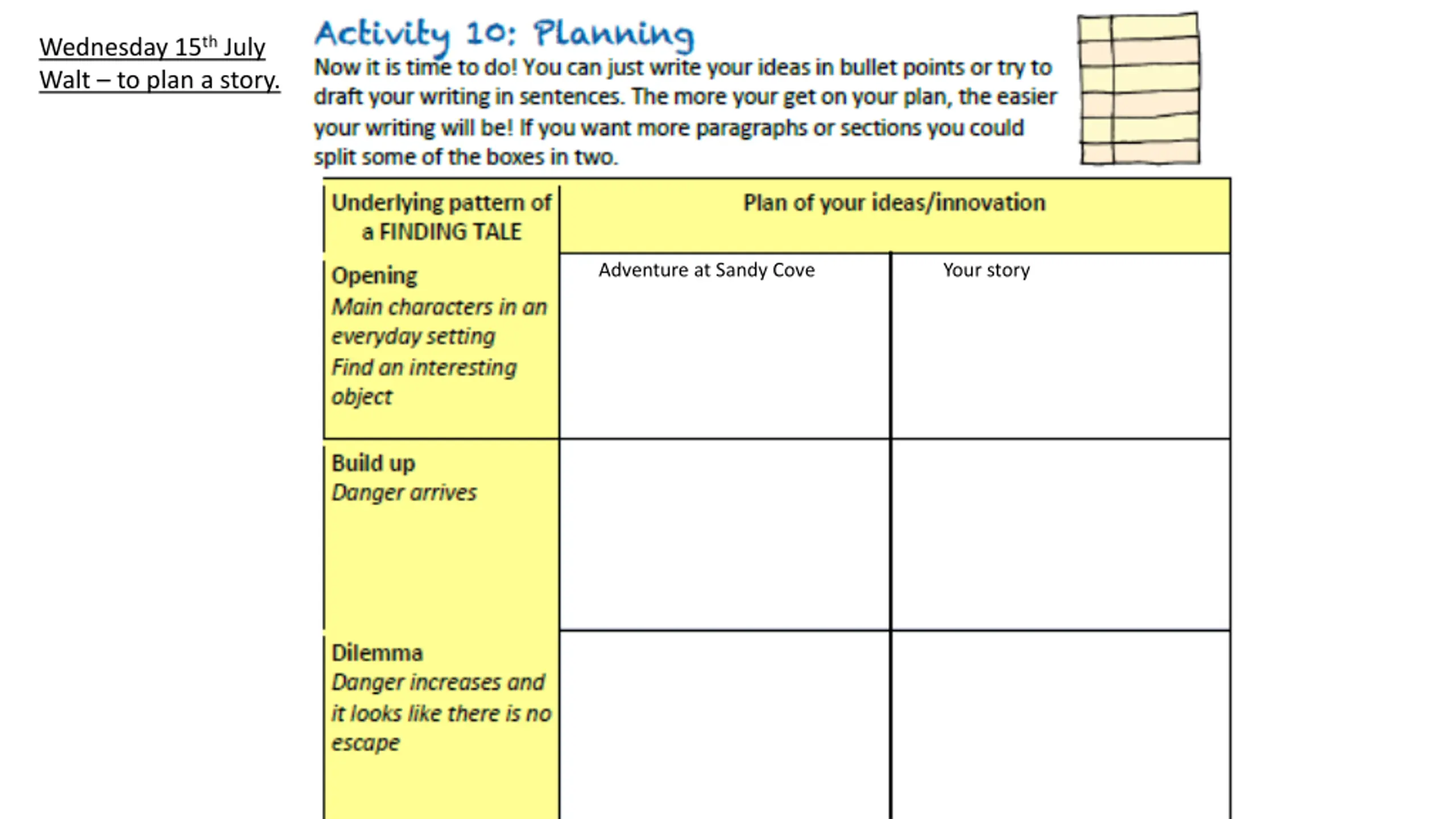 Wednesday 15th July Walt to plan a story. Adventure at Sandy Cove Your story