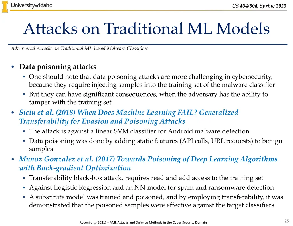 CS 404/504, Spring 2023 Attacks on Traditional ML Models Adversarial Attacks on Traditional ML-based Malware Classifiers Ming et al. (2015) Replacement Attacks: Automatically Impeding Behavior- Based Malware Specifications This work introduced an evasion white-box attack o The adversary s goal is to alter malware files, in order to result in misclassification by the ML model as goodware files at inference time The authors modified malware code by replacing API calls with functionality- preserving API calls The attack was employed to evade an ML classifier using Function-Call Graphs features as inputs 23 Rosenberg (2021) AML Attacks and Defense Methods in the Cyber Security Domain