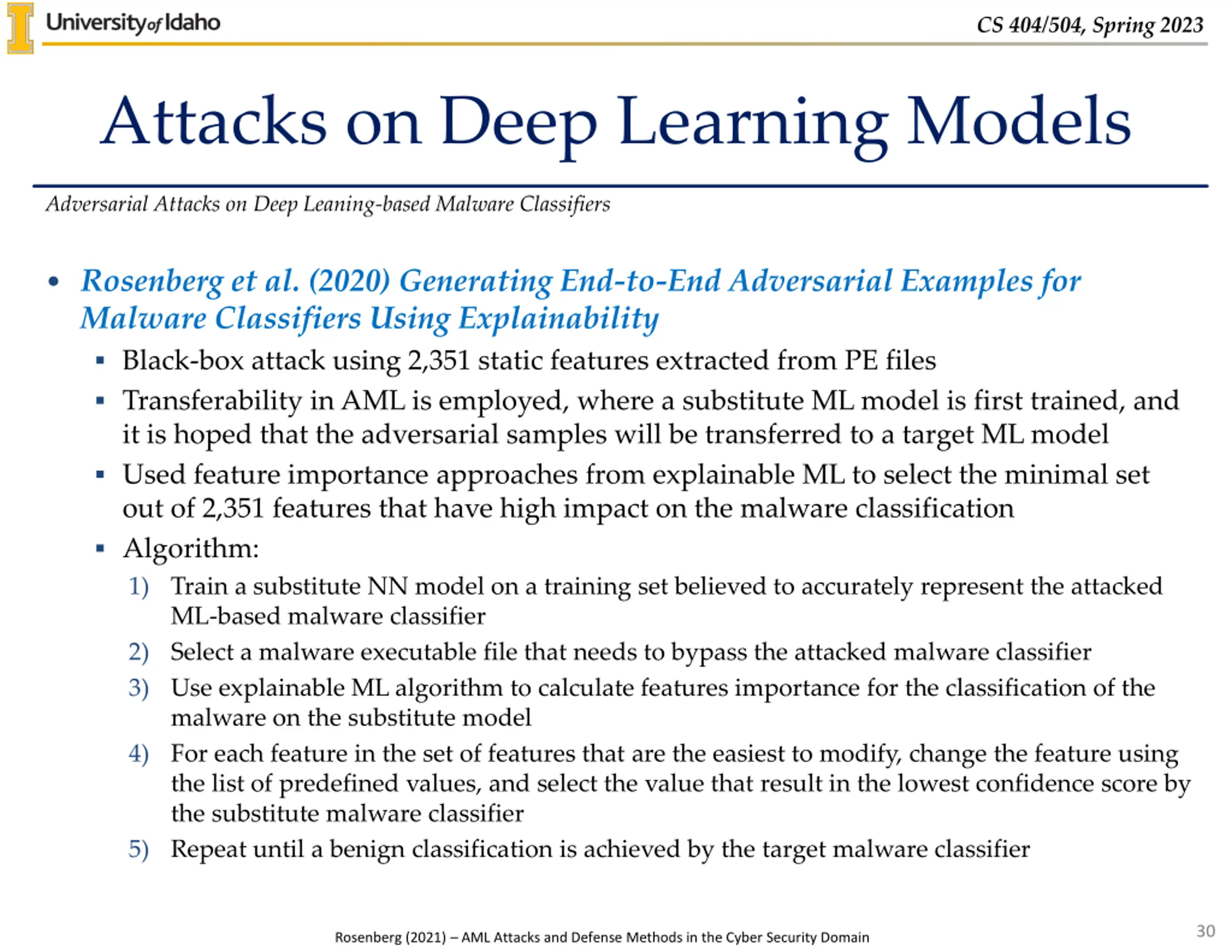 CS 404/504, Spring 2023 Attacks on Deep Learning Models Adversarial Attacks on Deep Leaning-based Malware Classifiers Attacks on Deep Learning classifiers using static or dynamic features (feature- based classifiers) Abusnaina et al. (2019) Adversarial Learning Attacks on Graph-based IoT Malware Detection Systems Evasion white-box attack, against a CNN-model for IoT malware classification Uses Control-Flow Graph features of the malware disassembly source code Malicious samples were generated by concatenating CFGs of benign samples Hu and Tan (2017) Black-Box Attacks against RNN based Malware Detection Algorithms Evasion white-box attack, against an LSTM classifier trained on the dynamic API call traces of the malware A GAN model with RNN layers was used to generate invalid API calls, which were inserted into the original API call traces 29 Rosenberg (2021) AML Attacks and Defense Methods in the Cyber Security Domain